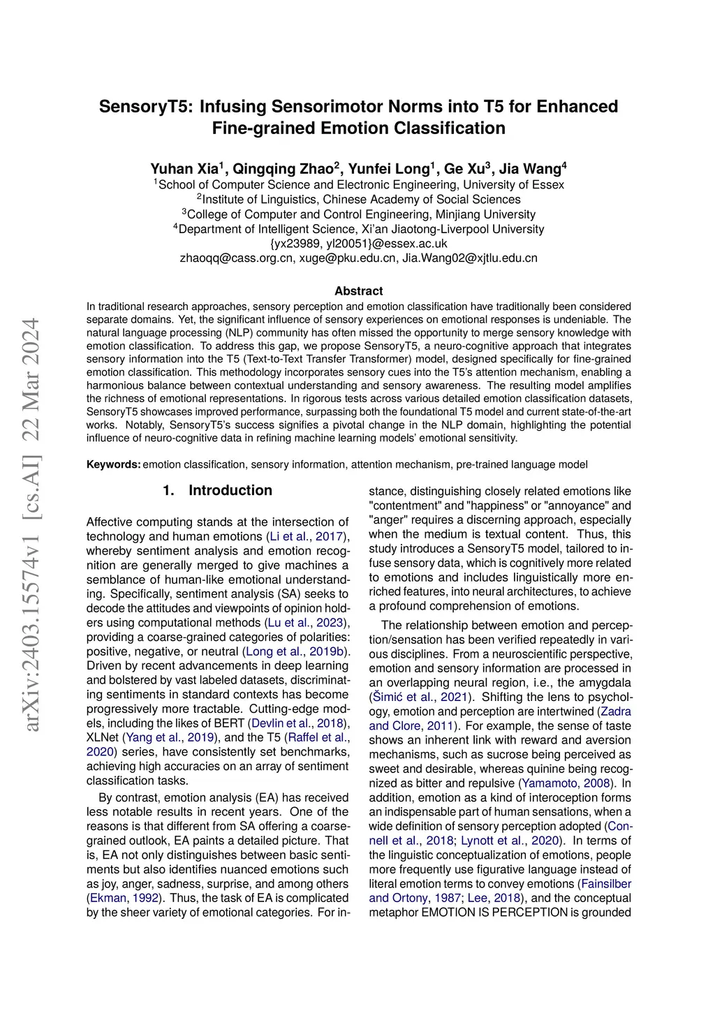 In traditional research approaches, sensory perception and emotion classification have traditionally been considered separate domains. Yet, the significant influence of sensory experiences on emotional responses is undeniable. The natural language processing (NLP) community has often missed the opportunity to merge sensory knowledge with emotion classification. To address this gap, we propose SensoryT5, a neuro-cognitive approach that integrates sensory information into the T5 (Text-to-Text Transfer Transformer) model, designed specifically for fine-grained emotion classification. This methodology incorporates sensory cues into the T5's attention mechanism, enabling a harmonious balance between contextual understanding and sensory awareness. The resulting model amplifies the richness of emotional representations. In rigorous tests across various detailed emotion classification datasets, SensoryT5 showcases improved performance, surpassing both the foundational T5 model and current state-of-the-art works. Notably, SensoryT5's success signifies a pivotal change in the NLP domain, highlighting the potential influence of neuro-cognitive data in refining machine learning models' emotional sensitivity.
