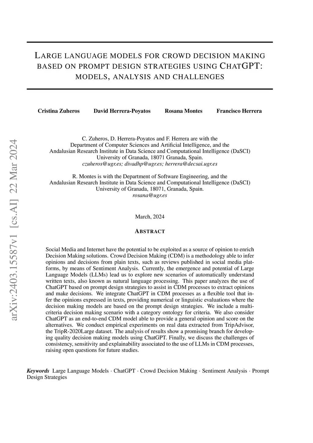 Large language models for crowd decision making based on prompt design strategies using ChatGPT: models, analysis and challenges