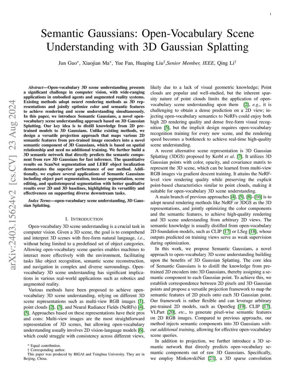 Open-vocabulary 3D scene understanding presents a significant challenge in computer vision, withwide-ranging applications in embodied agents and augmented reality systems. Previous approaches haveadopted Neural Radiance Fields (NeRFs) to analyze 3D scenes. In this paper, we introduce SemanticGaussians, a novel open-vocabulary scene understanding approach based on 3D Gaussian Splatting. Our keyidea is distilling pre-trained 2D semantics into 3D Gaussians. We design a versatile projection approachthat maps various 2Dsemantic features from pre-trained image encoders into a novel semantic component of 3D Gaussians, withoutthe additional training required by NeRFs. We further build a 3D semantic network that directly predictsthe semantic component from raw 3D Gaussians for fast inference. We explore several applications ofSemantic Gaussians: semantic segmentation on ScanNet-20, where our approach attains a 4.2% mIoU and 4.0%mAcc improvement over prior open-vocabulary scene understanding counterparts; object part segmentation,sceneediting, and spatial-temporal segmentation with better qualitative results over 2D and 3D baselines,highlighting its versatility and effectiveness on supporting diverse downstream tasks.