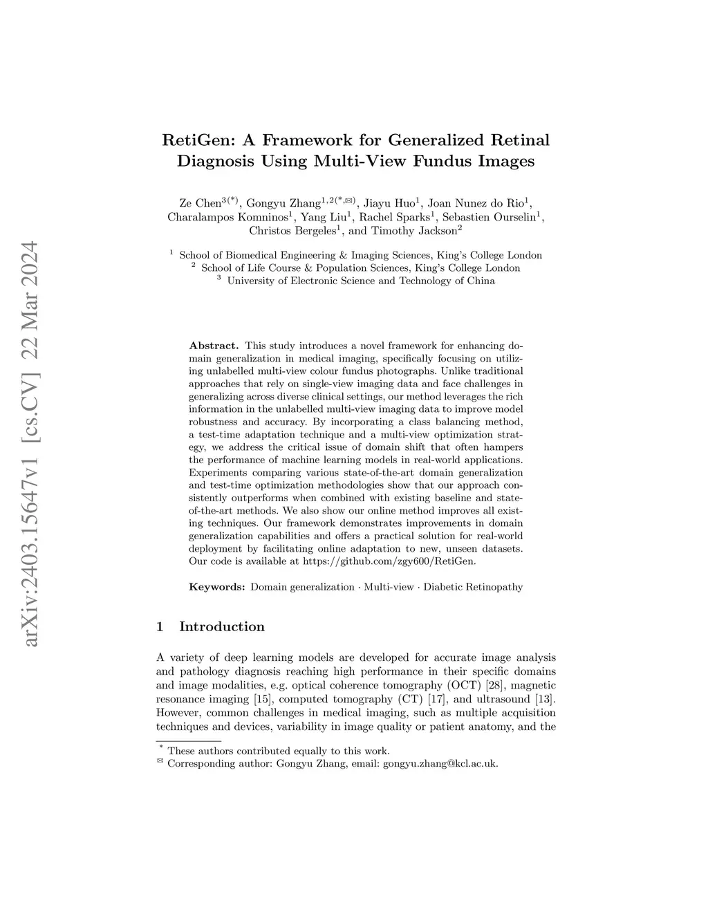 This study introduces a novel framework for enhancing domain generalization in medical imaging, specifically focusing on utilizing unlabelled multi-view colour fundus photographs. Unlike traditional approaches that rely on single-view imaging data and face challenges in generalizing across diverse clinical settings, our method leverages the rich information in the unlabelled multi-view imaging data to improve model robustness and accuracy. By incorporating a class balancing method, a test-time adaptation technique and a multi-view optimization strategy, we address the critical issue of domain shift that often hampers the performance of machine learning models in real-world applications. Experiments comparing various state-of-the-art domain generalization and test-time optimization methodologies show that our approach consistently outperforms when combined with existing baseline and state-of-the-art methods. We also show our online method improves all existing techniques. Our framework demonstrates improvements in domain generalization capabilities and offers a practical solution for real-world deployment by facilitating online adaptation to new, unseen datasets. Our code is available at https://github.com/zgy600/RetiGen .