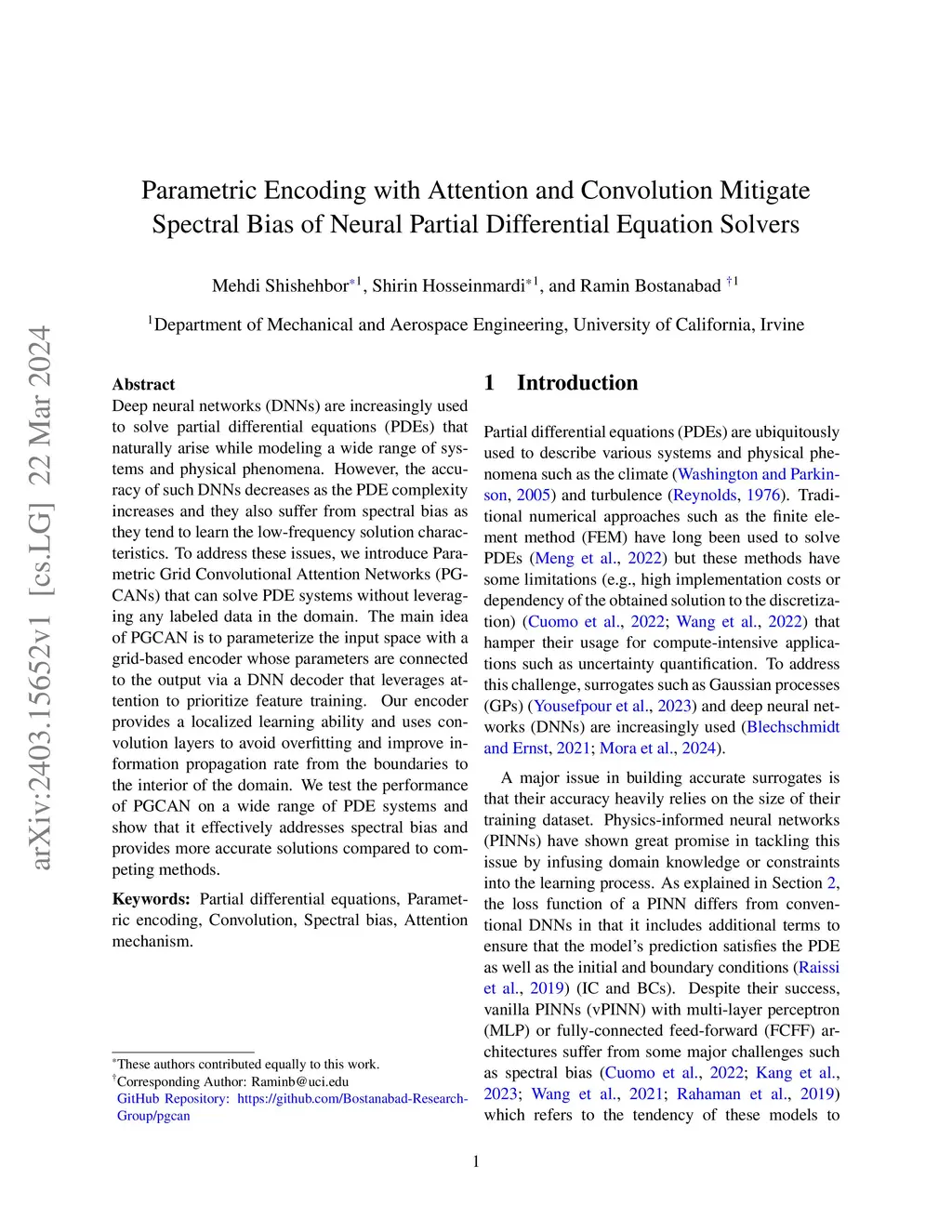 Deep neural networks (DNNs) are increasingly used to solve partial differential equations (PDEs) that naturally arise while modeling a wide range of systems and physical phenomena. However, the accuracy of such DNNs decreases as the PDE complexity increases and they also suffer from spectral bias as they tend to learn the low-frequency solution characteristics. To address these issues, we introduce Parametric Grid Convolutional Attention Networks (PGCANs) that can solve PDE systems without leveraging any labeled data in the domain. The main idea of PGCAN is to parameterize the input space with a grid-based encoder whose parameters are connected to the output via a DNN decoder that leverages attention to prioritize feature training. Our encoder provides a localized learning ability and uses convolution layers to avoid overfitting and improve information propagation rate from the boundaries to the interior of the domain. We test the performance of PGCAN on a wide range of PDE systems and show that it effectively addresses spectral bias and provides more accurate solutions compared to competing methods.