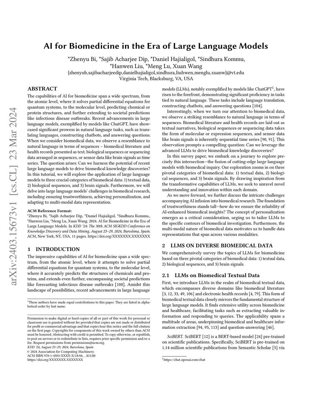 The capabilities of AI for biomedicine span a wide spectrum, from the atomic level, where it solves partial differential equations for quantum systems, to the molecular level, predicting chemical or protein structures, and further extending to societal predictions like infectious disease outbreaks. Recent advancements in large language models, exemplified by models like ChatGPT, have showcased significant prowess in natural language tasks, such as translating languages, constructing chatbots, and answering questions. When we consider biomedical data, we observe a resemblance to natural language in terms of sequences: biomedical literature and health records presented as text, biological sequences or sequencing data arranged in sequences, or sensor data like brain signals as time series. The question arises: Can we harness the potential of recent large language models to drive biomedical knowledge discoveries? In this survey, we will explore the application of large language models to three crucial categories of biomedical data: 1) textual data, 2) biological sequences, and 3) brain signals. Furthermore, we will delve into large language model challenges in biomedical research, including ensuring trustworthiness, achieving personalization, and adapting to multi-modal data representation