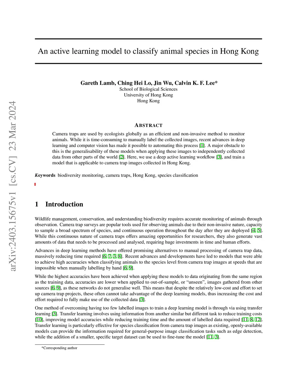 Camera traps are used by ecologists globally as an efficient and non-invasive method to monitor animals. While it is time-consuming to manually label the collected images, recent advances in deep learning and computer vision has made it possible to automating this process [1]. A major obstacle to this is the generalisability of these models when applying these images to independently collected data from other parts of the world [2]. Here, we use a deep active learning workflow [3], and train a model that is applicable to camera trap images collected in Hong Kong.