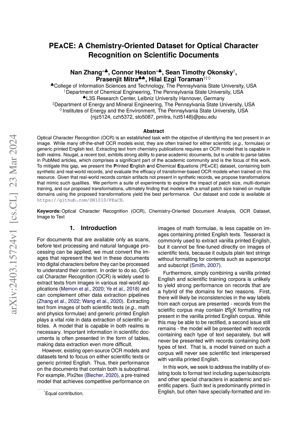 PEaCE: A Chemistry-Oriented Dataset for Optical Character Recognition on
