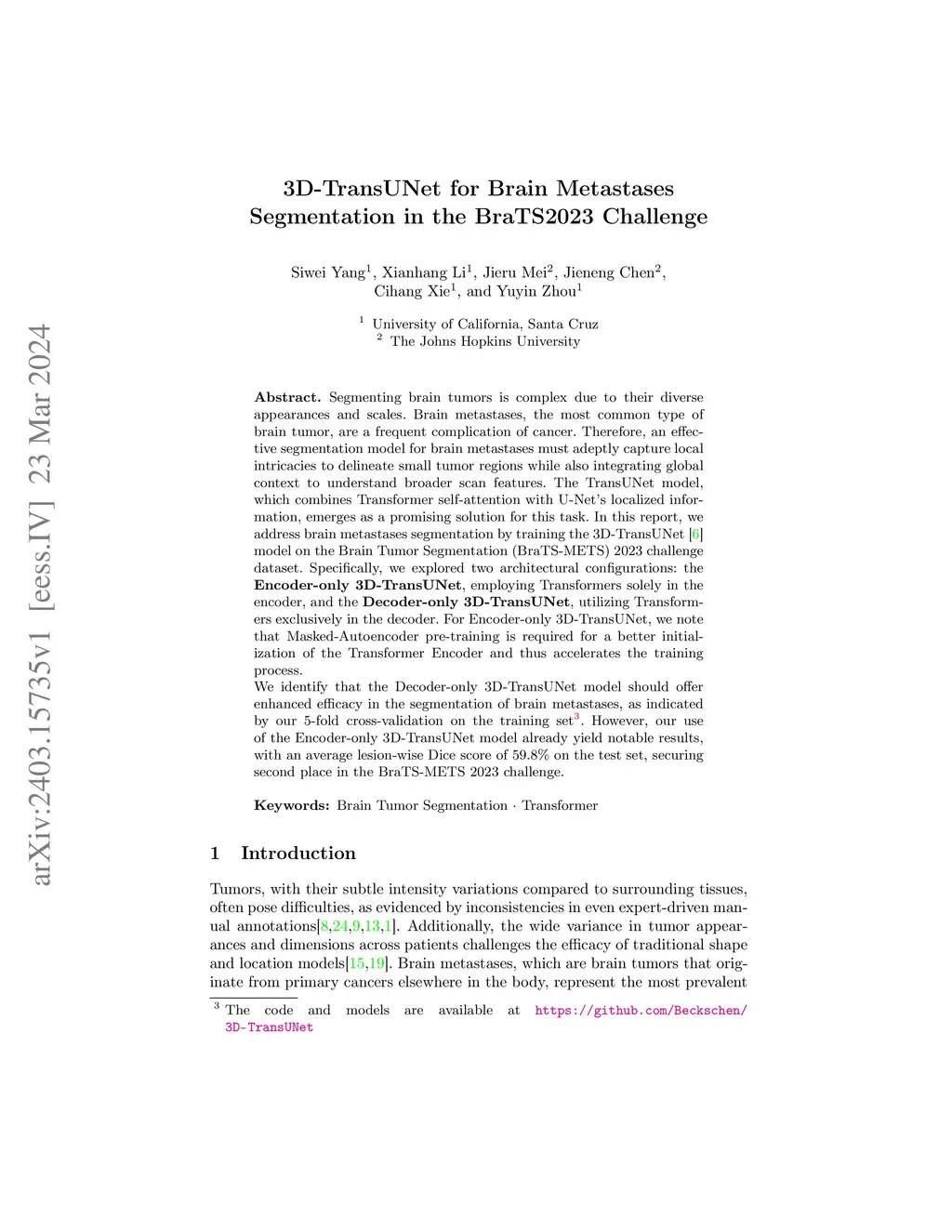 Segmenting brain tumors is complex due to their diverse appearances and scales. Brain metastases, the most common type of brain tumor, are a frequent complication of cancer. Therefore, an effective segmentation model for brain metastases must adeptly capture local intricacies to delineate small tumor regions while also integrating global context to understand broader scan features. The TransUNet model, which combines Transformer self-attention with U-Net's localized information, emerges as a promising solution for this task. In this report, we address brain metastases segmentation by training the 3D-TransUNet model on the Brain Tumor Segmentation (BraTS-METS) 2023 challenge dataset. Specifically, we explored two architectural configurations: the Encoder-only 3D-TransUNet, employing Transformers solely in the encoder, and the Decoder-only 3D-TransUNet, utilizing Transformers exclusively in the decoder. For Encoder-only 3D-TransUNet, we note that Masked-Autoencoder pre-training is required for a better initialization of the Transformer Encoder and thus accelerates the training process. We identify that the Decoder-only 3D-TransUNet model should offer enhanced efficacy in the segmentation of brain metastases, as indicated by our 5-fold cross-validation on the training set. However, our use of the Encoder-only 3D-TransUNet model already yield notable results, with an average lesion-wise Dice score of 59.8\% on the test set, securing second place in the BraTS-METS 2023 challenge.