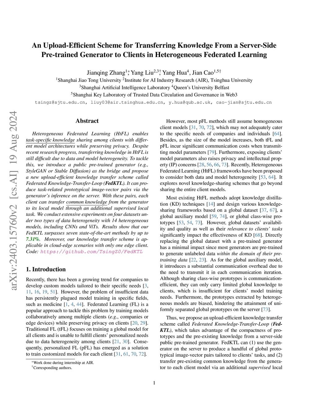 Heterogeneous Federated Learning (HtFL) enables collaborative learning on multiple clients with different model architectures while preserving privacy. Despite recent research progress, knowledge sharing in HtFL is still difficult due to data and model heterogeneity. To tackle this issue, we leverage the knowledge stored in pre-trained generators and propose a new upload-efficient knowledge transfer scheme called Federated Knowledge-Transfer Loop (FedKTL). Our FedKTL can produce client-task-related prototypical image-vector pairs via the generator's inference on the server. With these pairs, each client can transfer pre-existing knowledge from the generator to its local model through an additional supervised local task. We conduct extensive experiments on four datasets under two types of data heterogeneity with 14 kinds of models including CNNs and ViTs. Results show that our upload-efficient FedKTL surpasses seven state-of-the-art methods by up to 7.31% in accuracy. Moreover, our knowledge transfer scheme is applicable in scenarios with only one edge client. Code: https://github.com/TsingZ0/FedKTL