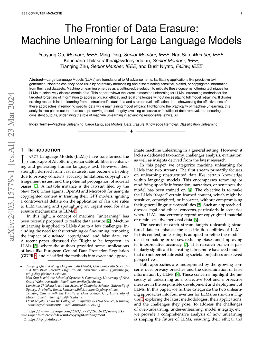 Large Language Models (LLMs) are foundational to AI advancements, facilitating applications like predictive text generation. Nonetheless, they pose risks by potentially memorizing and disseminating sensitive, biased, or copyrighted information from their vast datasets. Machine unlearning emerges as a cutting-edge solution to mitigate these concerns, offering techniques for LLMs to selectively discard certain data. This paper reviews the latest in machine unlearning for LLMs, introducing methods for the targeted forgetting of information to address privacy, ethical, and legal challenges without necessitating full model retraining. It divides existing research into unlearning from unstructured/textual data and structured/classification data, showcasing the effectiveness of these approaches in removing specific data while maintaining model efficacy. Highlighting the practicality of machine unlearning, this analysis also points out the hurdles in preserving model integrity, avoiding excessive or insufficient data removal, and ensuring consistent outputs, underlining the role of machine unlearning in advancing responsible, ethical AI.