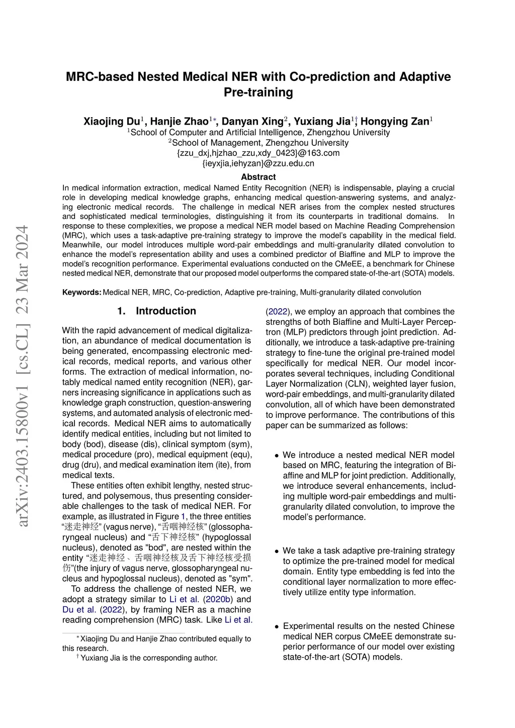 In medical information extraction, medical Named Entity Recognition (NER) is indispensable, playing a crucial role in developing medical knowledge graphs, enhancing medical question-answering systems, and analyzing electronic medical records. The challenge in medical NER arises from the complex nested structures and sophisticated medical terminologies, distinguishing it from its counterparts in traditional domains. In response to these complexities, we propose a medical NER model based on Machine Reading Comprehension (MRC), which uses a task-adaptive pre-training strategy to improve the model's capability in the medical field. Meanwhile, our model introduces multiple word-pair embeddings and multi-granularity dilated convolution to enhance the model's representation ability and uses a combined predictor of Biaffine and MLP to improve the model's recognition performance. Experimental evaluations conducted on the CMeEE, a benchmark for Chinese nested medical NER, demonstrate that our proposed model outperforms the compared state-of-the-art (SOTA) models.
