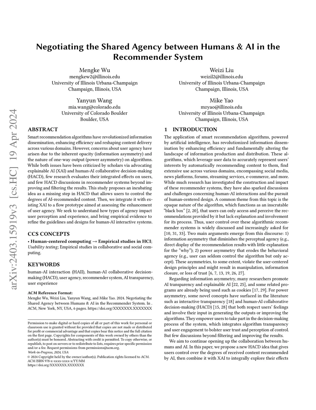 Smart recommendation algorithms have revolutionized information dissemination, enhancing efficiency and reshaping content delivery across various domains. However, concerns about user agency have arisen due to the inherent opacity (information asymmetry) and the nature of one-way output (power asymmetry) on algorithms. While both issues have been criticized by scholars via advocating explainable AI (XAI) and human-AI collaborative decision-making (HACD), few research evaluates their integrated effects on users, and few HACD discussions in recommender systems beyond improving and filtering the results. This study proposes an incubating idea as a missing step in HACD that allows users to control the degrees of AI-recommended content. Then, we integrate it with existing XAI to a flow prototype aimed at assessing the enhancement of user agency. We seek to understand how types of agency impact user perception and experience, and bring empirical evidence to refine the guidelines and designs for human-AI interactive systems.