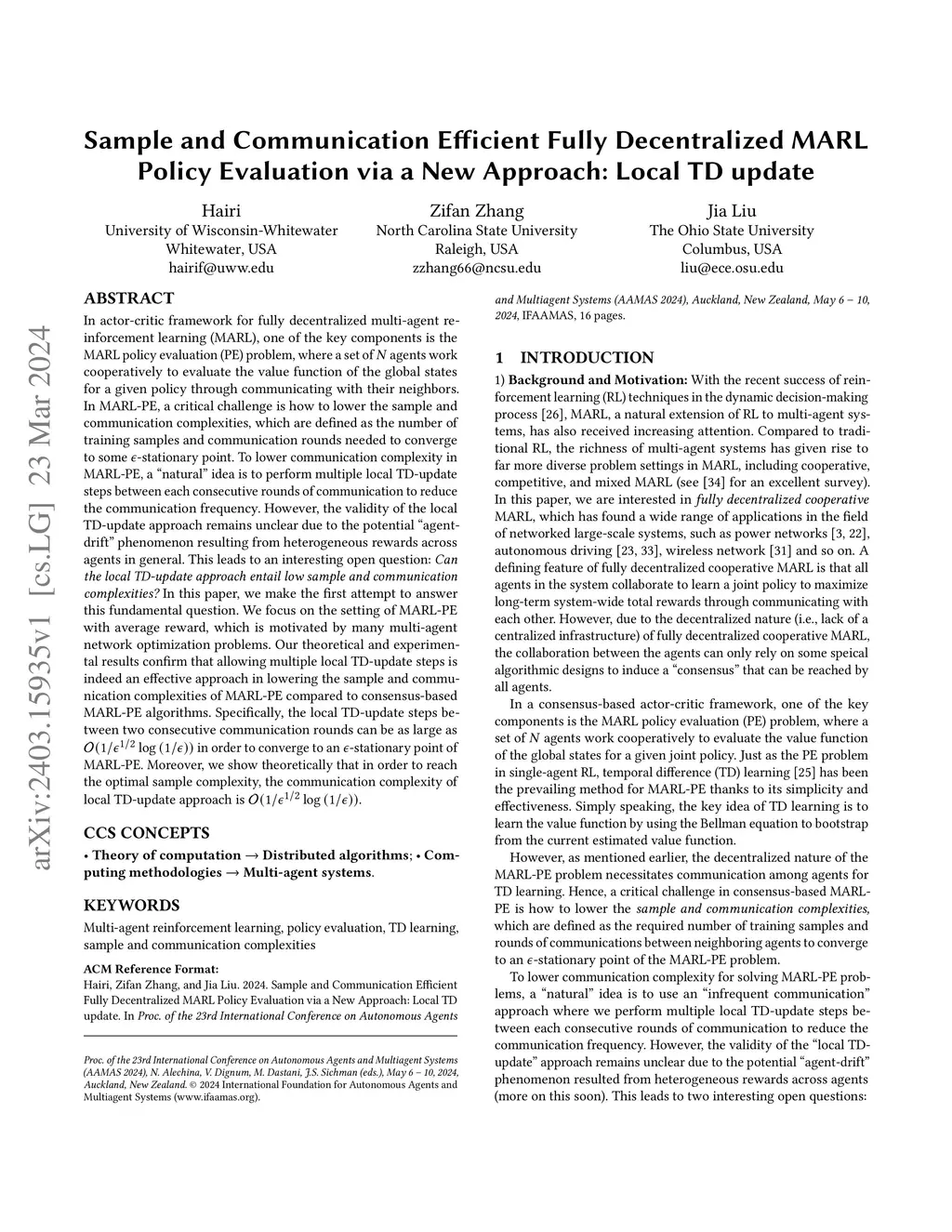 In actor-critic framework for fully decentralized multi-agent reinforcement learning (MARL), one of the key components is the MARL policy evaluation (PE) problem, where a set of agents work cooperatively to evaluate the value function of the global states for a given policy through communicating with their neighbors. In MARL-PE, a critical challenge is how to lower the sample and communication complexities, which are defined as the number of training samples and communication rounds needed to converge to some -stationary point. To lower communication complexity in MARL-PE, a "natural'' idea is to perform multiple local TD-update steps between each consecutive rounds of communication to reduce the communication frequency. However, the validity of the local TD-update approach remains unclear due to the potential "agent-drift'' phenomenon resulting from heterogeneous rewards across agents in general. This leads to an interesting open question: Can the local TD-update approach entail low sample and communication complexities? In this paper, we make the first attempt to answer this fundamental question. We focus on the setting of MARL-PE with average reward, which is motivated by many multi-agent network optimization problems. Our theoretical and experimental results confirm that allowing multiple local TD-update steps is indeed an effective approach in lowering the sample and communication complexities of MARL-PE compared to consensus-based MARL-PE algorithms. Specifically, the local TD-update steps between two consecutive communication rounds can be as large as in order to converge to an -stationary point of MARL-PE. Moreover, we show theoretically that in order to reach the optimal sample complexity, the communication complexity of local TD-update approach is .