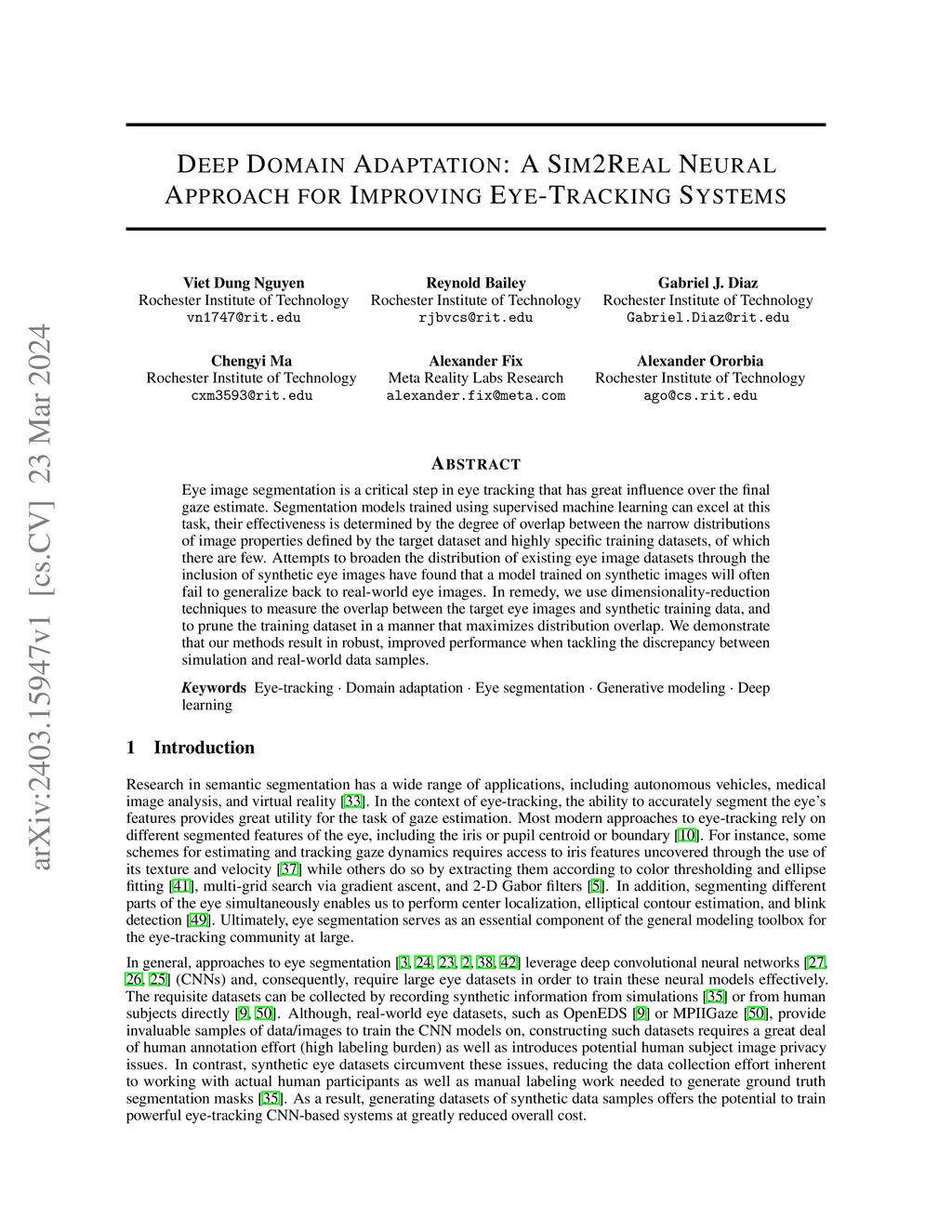 Eye image segmentation is a critical step in eye tracking that has great influence over the final gaze estimate. Segmentation models trained using supervised machine learning can excel at this task, their effectiveness is determined by the degree of overlap between the narrow distributions of image properties defined by the target dataset and highly specific training datasets, of which there are few. Attempts to broaden the distribution of existing eye image datasets through the inclusion of synthetic eye images have found that a model trained on synthetic images will often fail to generalize back to real-world eye images. In remedy, we use dimensionality-reduction techniques to measure the overlap between the target eye images and synthetic training data, and to prune the training dataset in a manner that maximizes distribution overlap. We demonstrate that our methods result in robust, improved performance when tackling the discrepancy between simulation and real-world data samples.