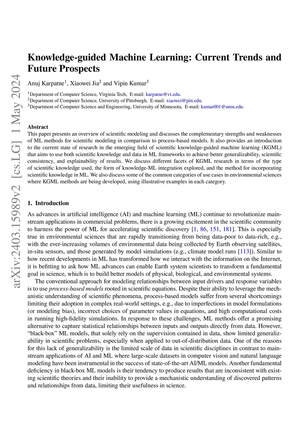 This paper presents an overview of scientific modeling and discusses the complementary strengths and weaknesses of ML methods for scientific modeling in comparison to process-based models. It also provides an introduction to the current state of research in the emerging field of scientific knowledge-guided machine learning (KGML) that aims to use both scientific knowledge and data in ML frameworks to achieve better generalizability, scientific consistency, and explainability of results. We discuss different facets of KGML research in terms of the type of scientific knowledge used, the form of knowledge-ML integration explored, and the method for incorporating scientific knowledge in ML. We also discuss some of the common categories of use cases in environmental sciences where KGML methods are being developed, using illustrative examples in each category.
