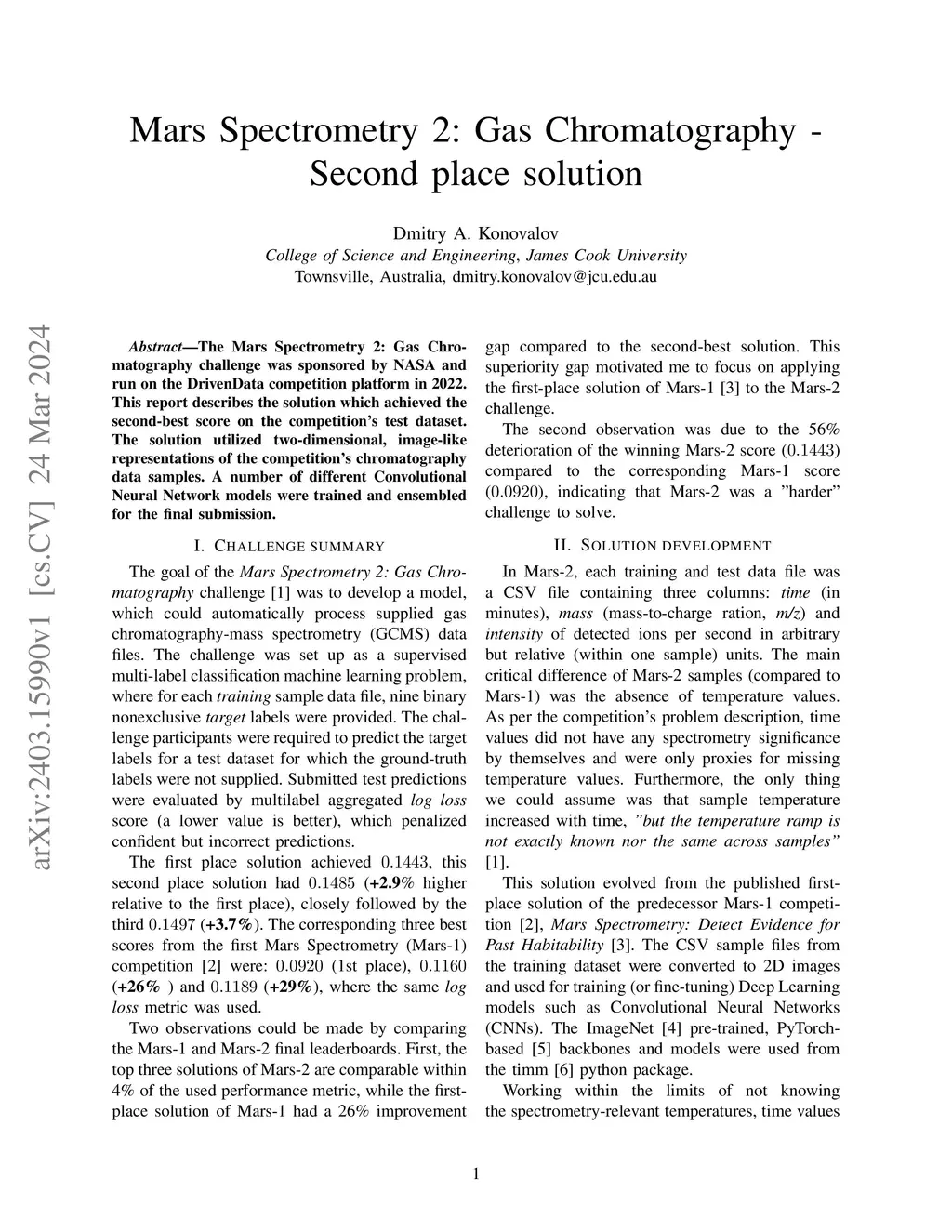 The Mars Spectrometry 2: Gas Chromatography challenge was sponsored by NASA and run on the DrivenData competition platform in 2022. This report describes the solution which achieved the second-best score on the competition's test dataset. The solution utilized two-dimensional, image-like representations of the competition's chromatography data samples. A number of different Convolutional Neural Network models were trained and ensembled for the final submission.