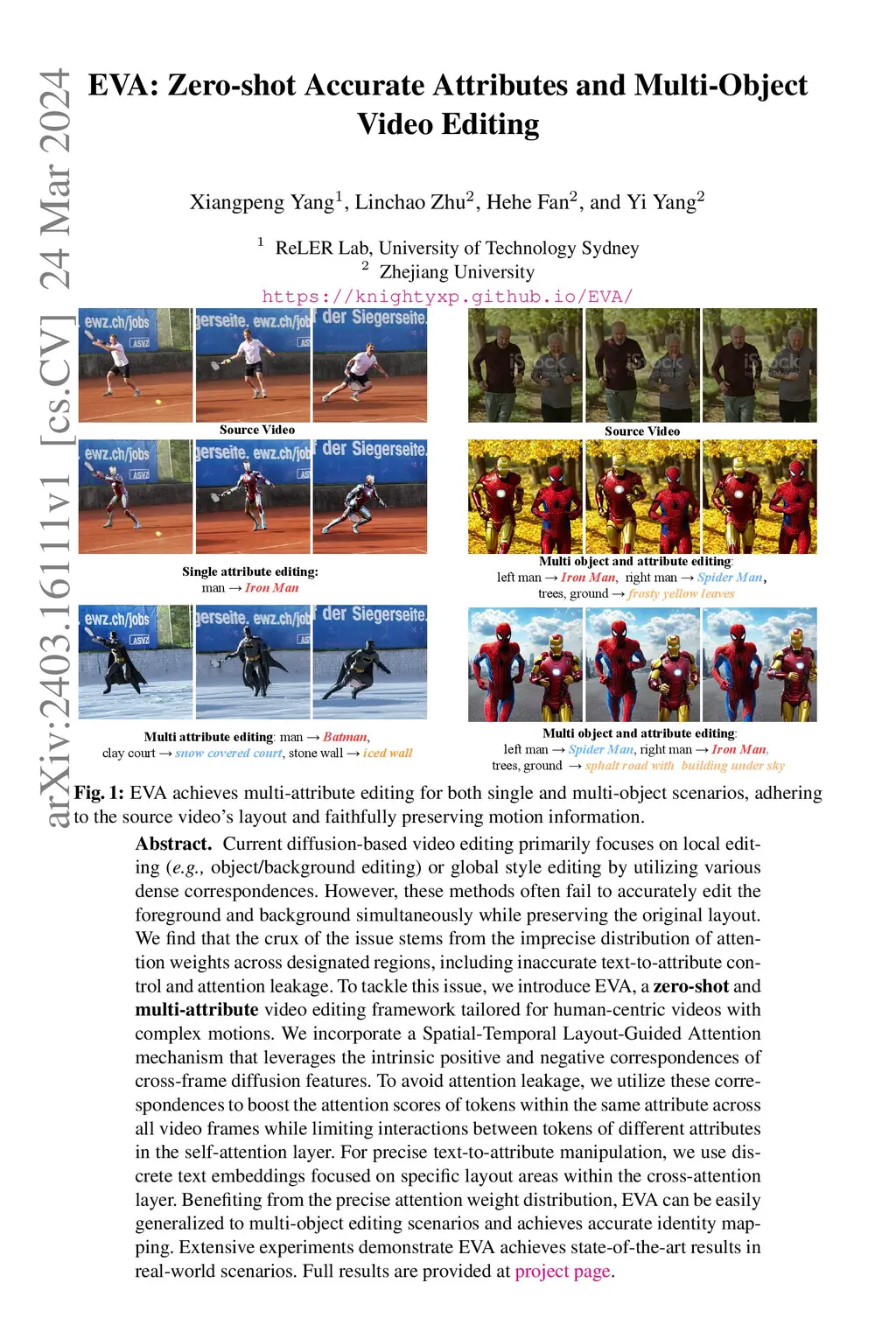 Current diffusion-based video editing primarily focuses on local editing (\textit{e.g.,} object/background editing) or global style editing by utilizing various dense correspondences. However, these methods often fail to accurately edit the foreground and background simultaneously while preserving the original layout. We find that the crux of the issue stems from the imprecise distribution of attention weights across designated regions, including inaccurate text-to-attribute control and attention leakage. To tackle this issue, we introduce EVA, a \textbf{zero-shot} and \textbf{multi-attribute} video editing framework tailored for human-centric videos with complex motions. We incorporate a Spatial-Temporal Layout-Guided Attention mechanism that leverages the intrinsic positive and negative correspondences of cross-frame diffusion features. To avoid attention leakage, we utilize these correspondences to boost the attention scores of tokens within the same attribute across all video frames while limiting interactions between tokens of different attributes in the self-attention layer. For precise text-to-attribute manipulation, we use discrete text embeddings focused on specific layout areas within the cross-attention layer. Benefiting from the precise attention weight distribution, EVA can be easily generalized to multi-object editing scenarios and achieves accurate identity mapping. Extensive experiments demonstrate EVA achieves state-of-the-art results in real-world scenarios. Full results are provided at https://knightyxp.github.io/EVA/