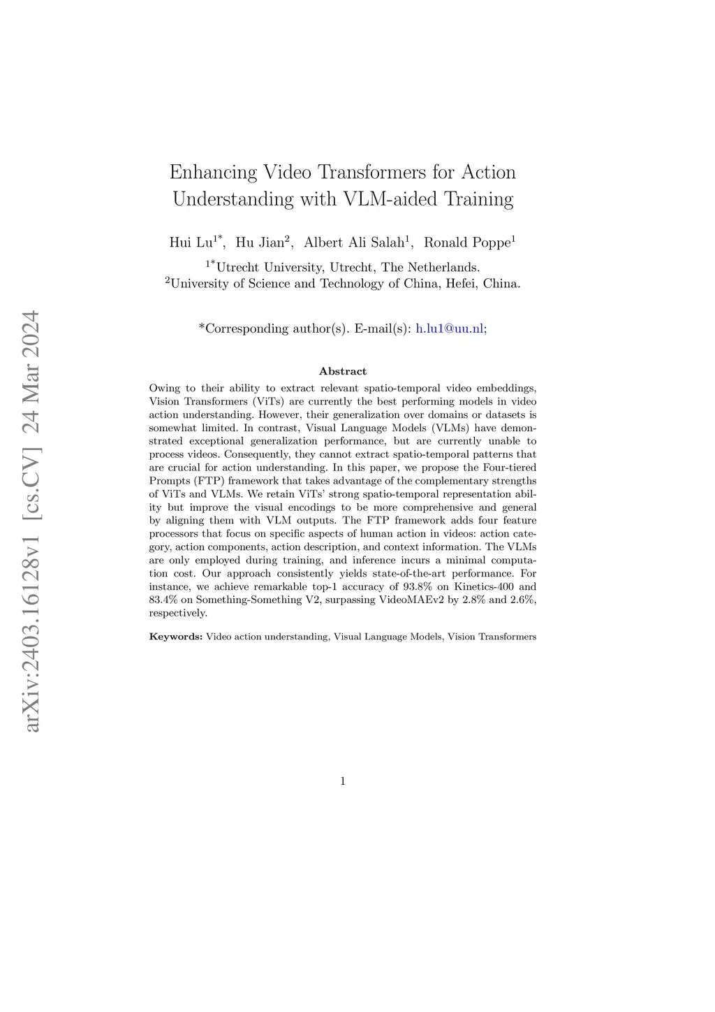 Owing to their ability to extract relevant spatio-temporal video embeddings, Vision Transformers (ViTs) are currently the best performing models in video action understanding. However, their generalization over domains or datasets is somewhat limited. In contrast, Visual Language Models (VLMs) have demonstrated exceptional generalization performance, but are currently unable to process videos. Consequently, they cannot extract spatio-temporal patterns that are crucial for action understanding. In this paper, we propose the Four-tiered Prompts (FTP) framework that takes advantage of the complementary strengths of ViTs and VLMs. We retain ViTs' strong spatio-temporal representation ability but improve the visual encodings to be more comprehensive and general by aligning them with VLM outputs. The FTP framework adds four feature processors that focus on specific aspects of human action in videos: action category, action components, action description, and context information. The VLMs are only employed during training, and inference incurs a minimal computation cost. Our approach consistently yields state-of-the-art performance. For instance, we achieve remarkable top-1 accuracy of 93.8% on Kinetics-400 and 83.4% on Something-Something V2, surpassing VideoMAEv2 by 2.8% and 2.6%, respectively.