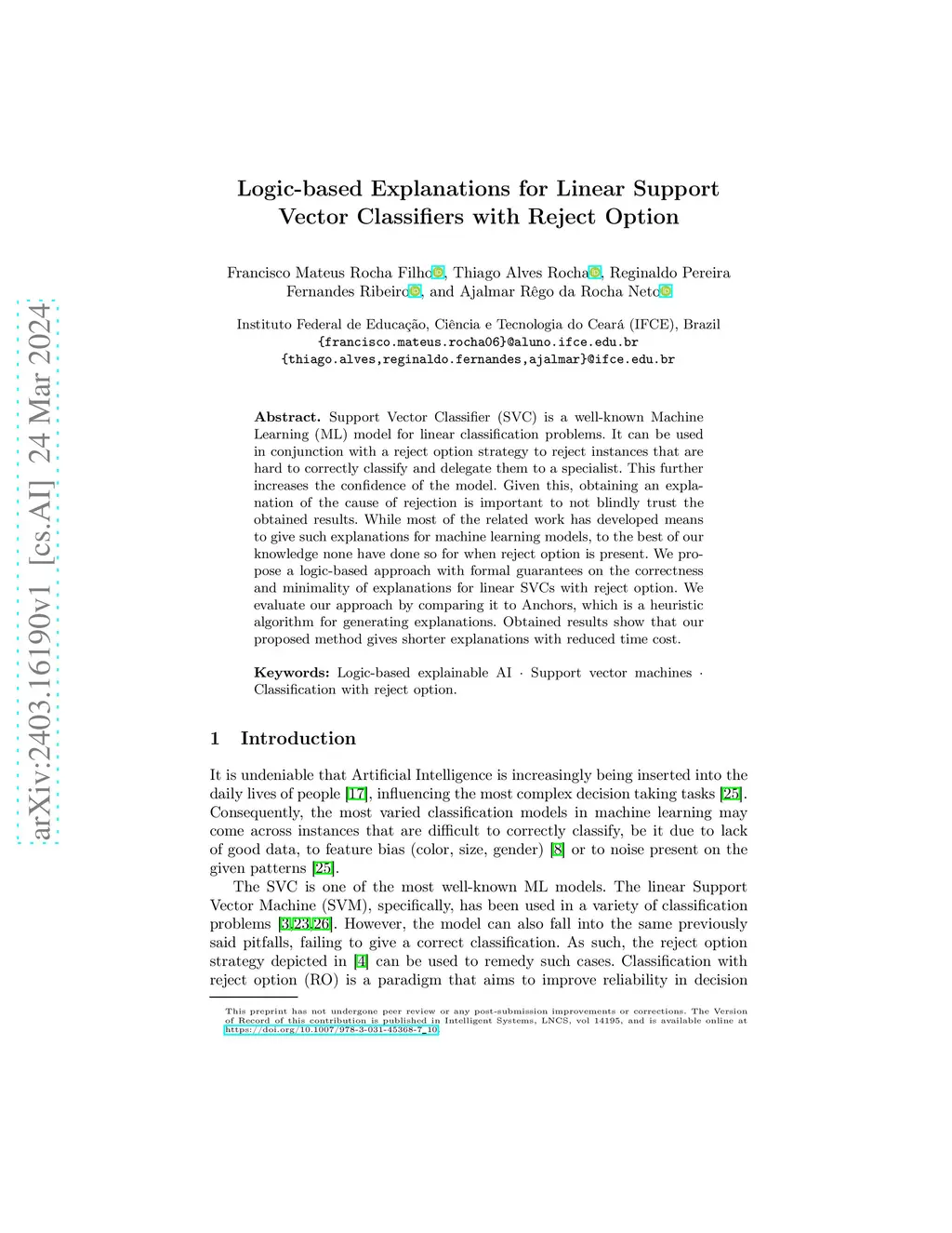 Support Vector Classifier (SVC) is a well-known Machine Learning (ML) model for linear classification problems. It can be used in conjunction with a reject option strategy to reject instances that are hard to correctly classify and delegate them to a specialist. This further increases the confidence of the model. Given this, obtaining an explanation of the cause of rejection is important to not blindly trust the obtained results. While most of the related work has developed means to give such explanations for machine learning models, to the best of our knowledge none have done so for when reject option is present. We propose a logic-based approach with formal guarantees on the correctness and minimality of explanations for linear SVCs with reject option. We evaluate our approach by comparing it to Anchors, which is a heuristic algorithm for generating explanations. Obtained results show that our proposed method gives shorter explanations with reduced time cost.