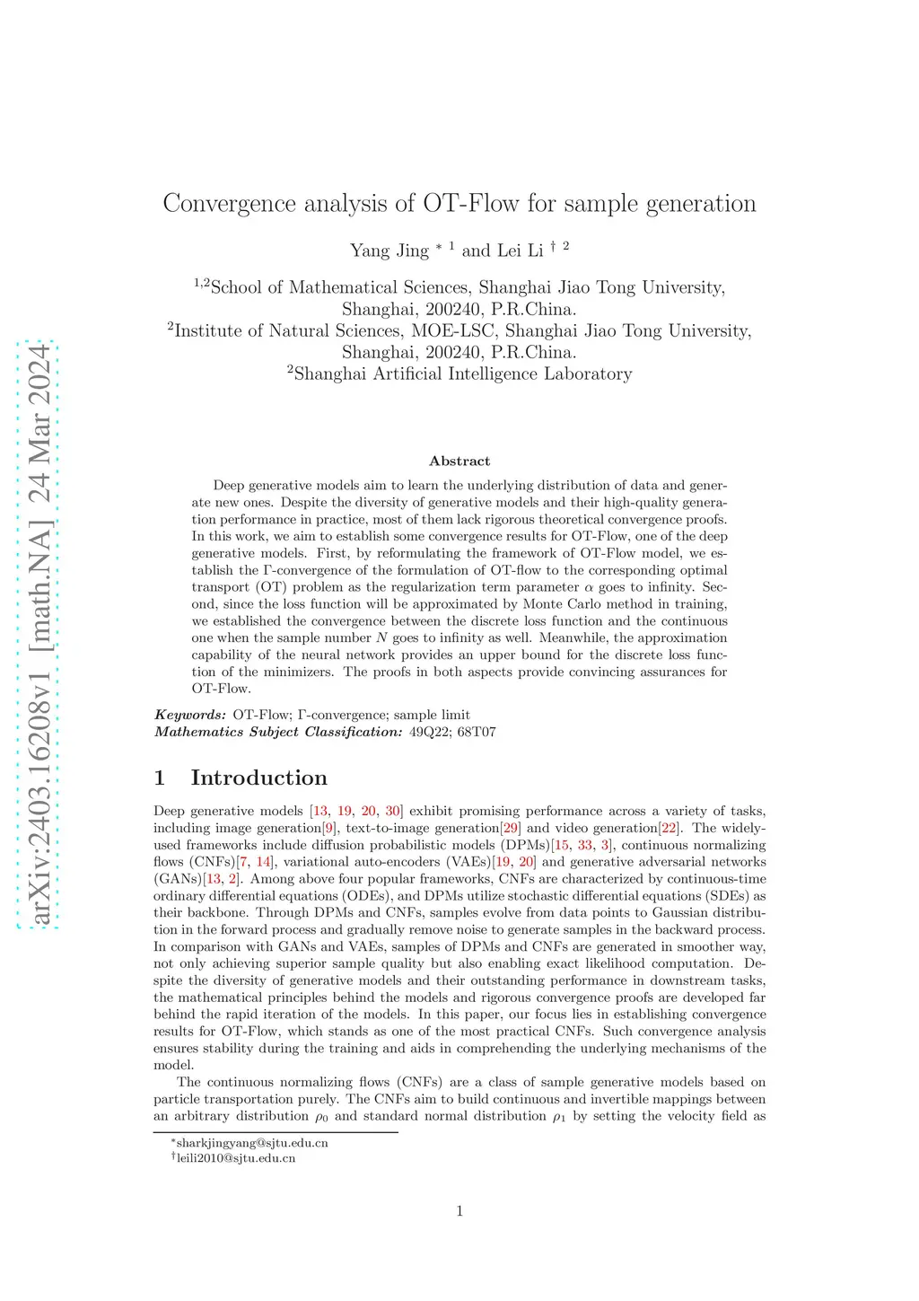 Deep generative models aim to learn the underlying distribution of data and generate new ones. Despite the diversity of generative models and their high-quality generation performance in practice, most of them lack rigorous theoretical convergence proofs. In this work, we aim to establish some convergence results for OT-Flow, one of the deep generative models. First, by reformulating the framework of OT-Flow model, we establish the -convergence of the formulation of OT-flow to the corresponding optimal transport (OT) problem as the regularization term parameter goes to infinity. Second, since the loss function will be approximated by Monte Carlo method in training, we established the convergence between the discrete loss function and the continuous one when the sample number goes to infinity as well. Meanwhile, the approximation capability of the neural network provides an upper bound for the discrete loss function of the minimizers. The proofs in both aspects provide convincing assurances for OT-Flow.