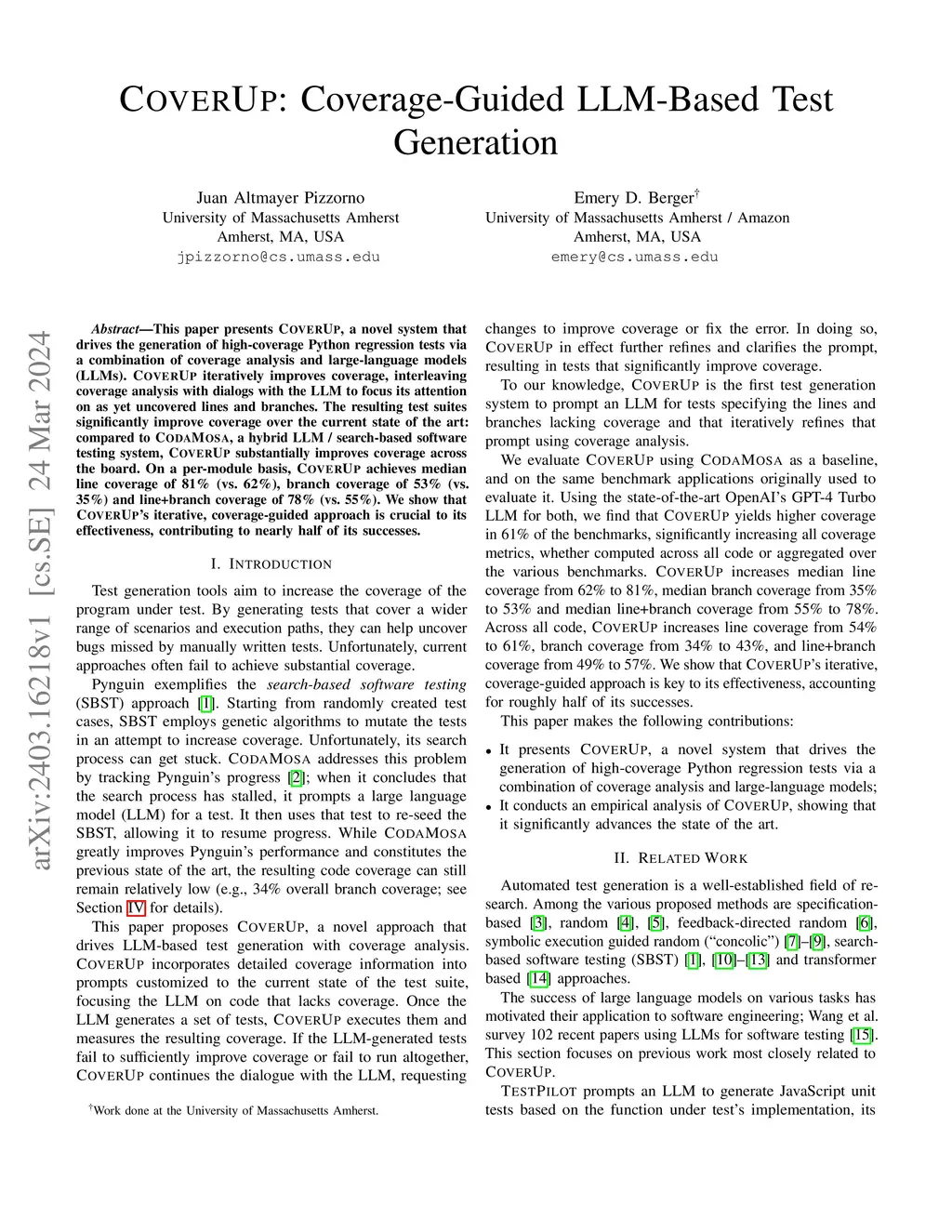 Testing is an essential part of software development. Test generation tools attempt to automate the otherwise labor-intensive task of test creation, but generating high-coverage tests remains challenging. This paper proposes CoverUp, a novel approach to driving the generation of high-coverage Python regression tests. CoverUp combines coverage analysis, code context, and feedback in prompts that iteratively guide the LLM to generate tests that improve line and branch coverage. We evaluate our prototype CoverUp implementation across a benchmark of challenging code derived from open-source Python projects and show that CoverUp substantially improves on the state of the art. Compared to CodaMosa, a hybrid search/LLM-based test generator, CoverUp achieves a per-module median line+branch coverage of 80% (vs. 47%). Compared to MuTAP, a mutation- and LLM-based test generator, CoverUp achieves an overall line+branch coverage of 90% (vs. 77%). We also demonstrate that CoverUp's performance stems not only from the LLM used but from the combined effectiveness of its components.