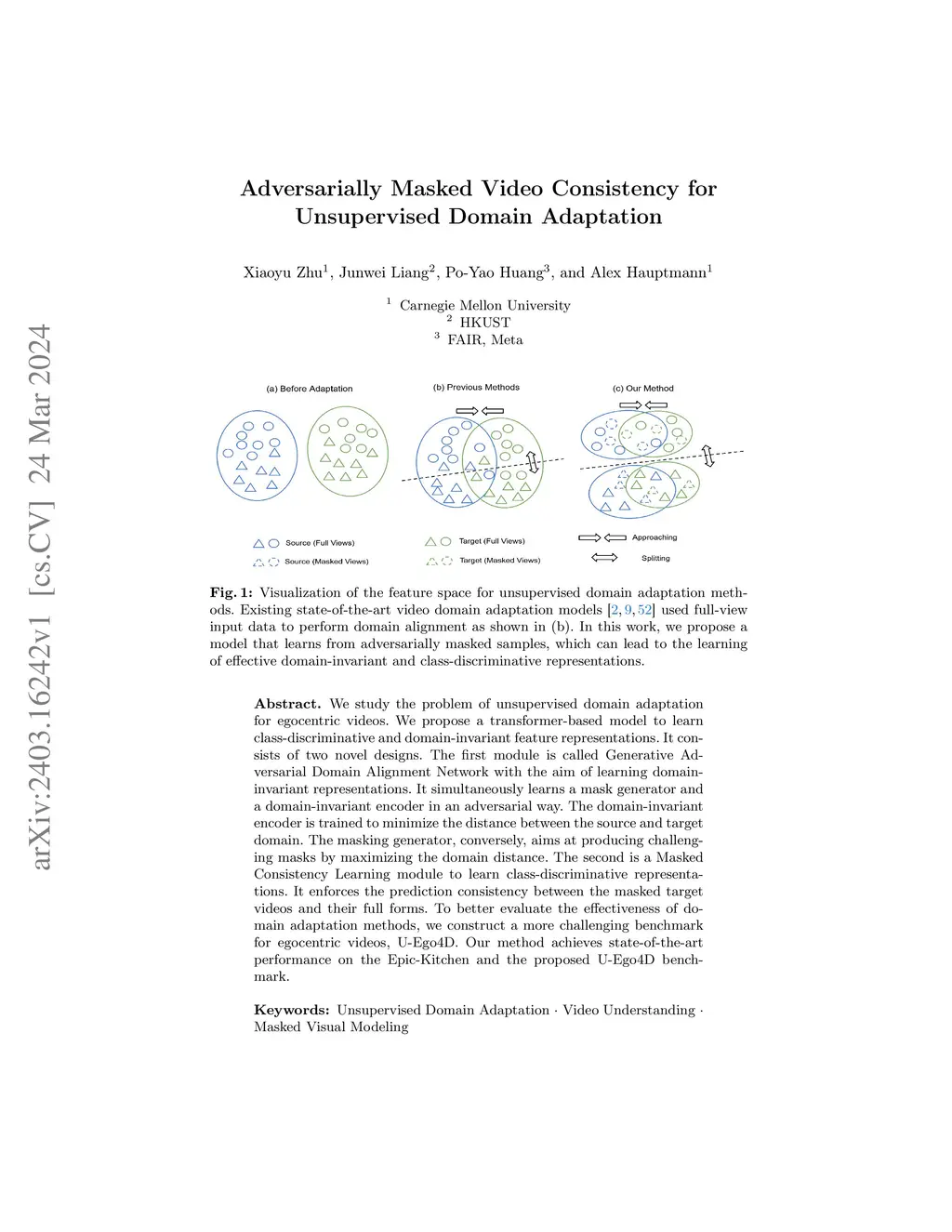 We study the problem of unsupervised domain adaptation for egocentric videos. We propose a transformer-based model to learn class-discriminative and domain-invariant feature representations. It consists of two novel designs. The first module is called Generative Adversarial Domain Alignment Network with the aim of learning domain-invariant representations. It simultaneously learns a mask generator and a domain-invariant encoder in an adversarial way. The domain-invariant encoder is trained to minimize the distance between the source and target domain. The masking generator, conversely, aims at producing challenging masks by maximizing the domain distance. The second is a Masked Consistency Learning module to learn class-discriminative representations. It enforces the prediction consistency between the masked target videos and their full forms. To better evaluate the effectiveness of domain adaptation methods, we construct a more challenging benchmark for egocentric videos, U-Ego4D. Our method achieves state-of-the-art performance on the Epic-Kitchen and the proposed U-Ego4D benchmark.