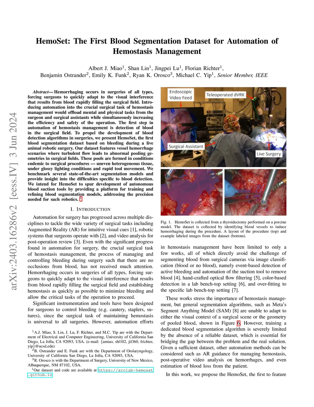 Hemorrhaging occurs in surgeries of all types, forcing surgeons to quickly adapt to the visual interference that results from blood rapidly filling the surgical field. Introducing automation into the crucial surgical task of hemostasis management would offload mental and physical tasks from the surgeon and surgical assistants while simultaneously increasing the efficiency and safety of the operation. The first step in automation of hemostasis management is detection of blood in the surgical field. To propel the development of blood detection algorithms in surgeries, we present HemoSet, the first blood segmentation dataset based on bleeding during a live animal robotic surgery. Our dataset features vessel hemorrhage scenarios where turbulent flow leads to abnormal pooling geometries in surgical fields. These pools are formed in conditions endemic to surgical procedures -- uneven heterogeneous tissue, under glossy lighting conditions and rapid tool movement. We benchmark several state-of-the-art segmentation models and provide insight into the difficulties specific to blood detection. We intend for HemoSet to spur development of autonomous blood suction tools by providing a platform for training and refining blood segmentation models, addressing the precision needed for such robotics.