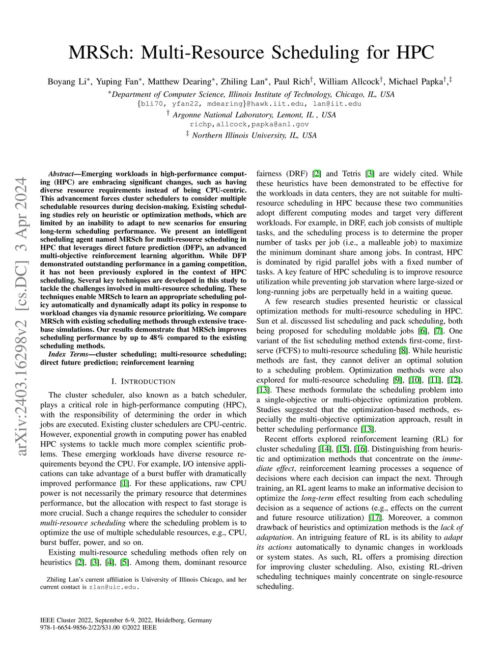 Emerging workloads in high-performance computing (HPC) are embracing significant changes, such as having diverse resource requirements instead of being CPU-centric. This advancement forces cluster schedulers to consider multiple schedulable resources during decision-making. Existing scheduling studies rely on heuristic or optimization methods, which are limited by an inability to adapt to new scenarios for ensuring long-term scheduling performance. We present an intelligent scheduling agent named MRSch for multi-resource scheduling in HPC that leverages direct future prediction (DFP), an advanced multi-objective reinforcement learning algorithm. While DFP demonstrated outstanding performance in a gaming competition, it has not been previously explored in the context of HPC scheduling. Several key techniques are developed in this study to tackle the challenges involved in multi-resource scheduling. These techniques enable MRSch to learn an appropriate scheduling policy automatically and dynamically adapt its policy in response to workload changes via dynamic resource prioritizing. We compare MRSch with existing scheduling methods through extensive tracebase simulations. Our results demonstrate that MRSch improves scheduling performance by up to 48% compared to the existing scheduling methods.