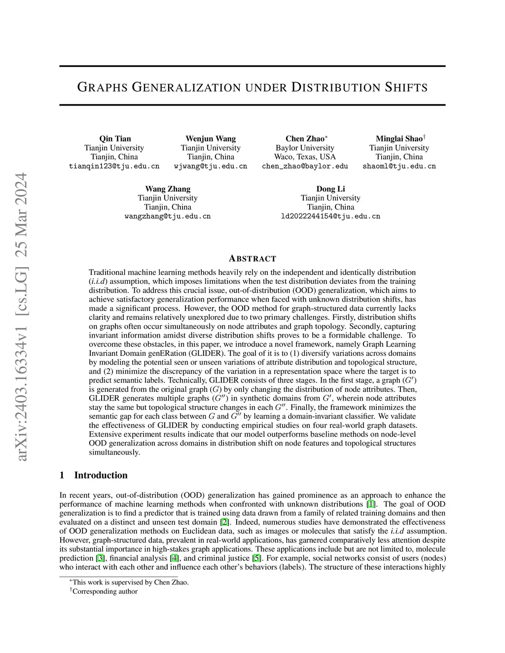 Traditional machine learning methods heavily rely on the independent and identically distribution assumption, which imposes limitations when the test distribution deviates from the training distribution. To address this crucial issue, out-of-distribution (OOD) generalization, which aims to achieve satisfactory generalization performance when faced with unknown distribution shifts, has made a significant process. However, the OOD method for graph-structured data currently lacks clarity and remains relatively unexplored due to two primary challenges. Firstly, distribution shifts on graphs often occur simultaneously on node attributes and graph topology. Secondly, capturing invariant information amidst diverse distribution shifts proves to be a formidable challenge. To overcome these obstacles, in this paper, we introduce a novel framework, namely Graph Learning Invariant Domain genERation (GLIDER). The goal is to (1) diversify variations across domains by modeling the potential seen or unseen variations of attribute distribution and topological structure and (2) minimize the discrepancy of the variation in a representation space where the target is to predict semantic labels. Extensive experiment results indicate that our model outperforms baseline methods on node-level OOD generalization across domains in distribution shift on node features and topological structures simultaneously.