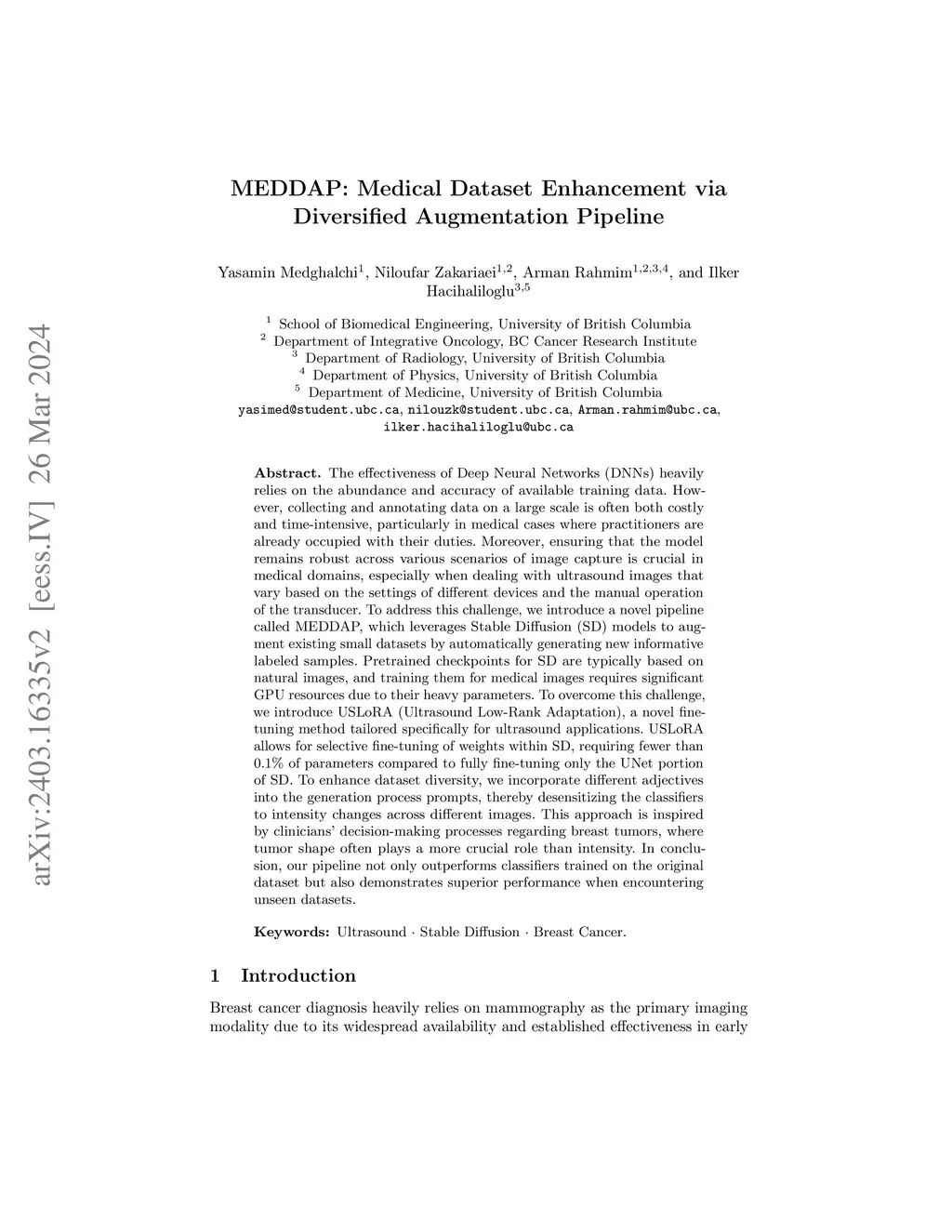 The effectiveness of Deep Neural Networks (DNNs) heavily relies on the abundance and accuracy of available training data. However, collecting and annotating data on a large scale is often both costly and time-intensive, particularly in medical cases where practitioners are already occupied with their duties. Moreover, ensuring that the model remains robust across various scenarios of image capture is crucial in medical domains, especially when dealing with ultrasound images that vary based on the settings of different devices and the manual operation of the transducer. To address this challenge, we introduce a novel pipeline called MEDDAP, which leverages Stable Diffusion (SD) models to augment existing small datasets by automatically generating new informative labeled samples. Pretrained checkpoints for SD are typically based on natural images, and training them for medical images requires significant GPU resources due to their heavy parameters. To overcome this challenge, we introduce USLoRA (Ultrasound Low-Rank Adaptation), a novel fine-tuning method tailored specifically for ultrasound applications. USLoRA allows for selective fine-tuning of weights within SD, requiring fewer than 0.1\% of parameters compared to fully fine-tuning only the UNet portion of SD. To enhance dataset diversity, we incorporate different adjectives into the generation process prompts, thereby desensitizing the classifiers to intensity changes across different images. This approach is inspired by clinicians' decision-making processes regarding breast tumors, where tumor shape often plays a more crucial role than intensity. In conclusion, our pipeline not only outperforms classifiers trained on the original dataset but also demonstrates superior performance when encountering unseen datasets. The source code is available at https://github.com/yasamin-med/MEDDAP.