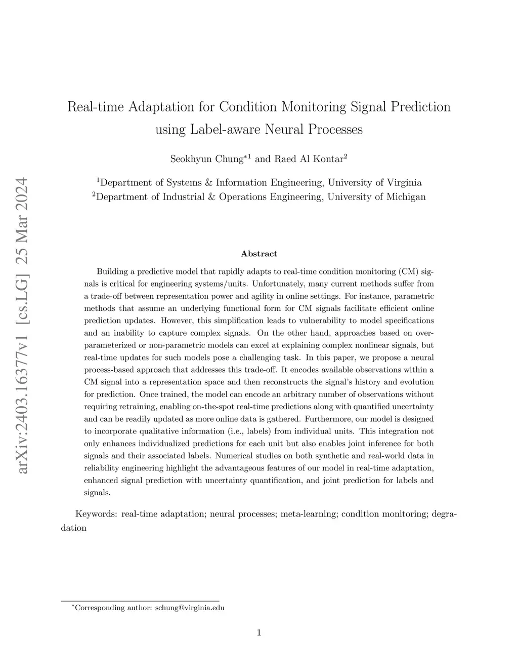 Building a predictive model that rapidly adapts to real-time condition monitoring (CM) signals is critical for engineering systems/units. Unfortunately, many current methods suffer from a trade-off between representation power and agility in online settings. For instance, parametric methods that assume an underlying functional form for CM signals facilitate efficient online prediction updates. However, this simplification leads to vulnerability to model specifications and an inability to capture complex signals. On the other hand, approaches based on over-parameterized or non-parametric models can excel at explaining complex nonlinear signals, but real-time updates for such models pose a challenging task. In this paper, we propose a neural process-based approach that addresses this trade-off. It encodes available observations within a CM signal into a representation space and then reconstructs the signal's history and evolution for prediction. Once trained, the model can encode an arbitrary number of observations without requiring retraining, enabling on-the-spot real-time predictions along with quantified uncertainty and can be readily updated as more online data is gathered. Furthermore, our model is designed to incorporate qualitative information (i.e., labels) from individual units. This integration not only enhances individualized predictions for each unit but also enables joint inference for both signals and their associated labels. Numerical studies on both synthetic and real-world data in reliability engineering highlight the advantageous features of our model in real-time adaptation, enhanced signal prediction with uncertainty quantification, and joint prediction for labels and signals.