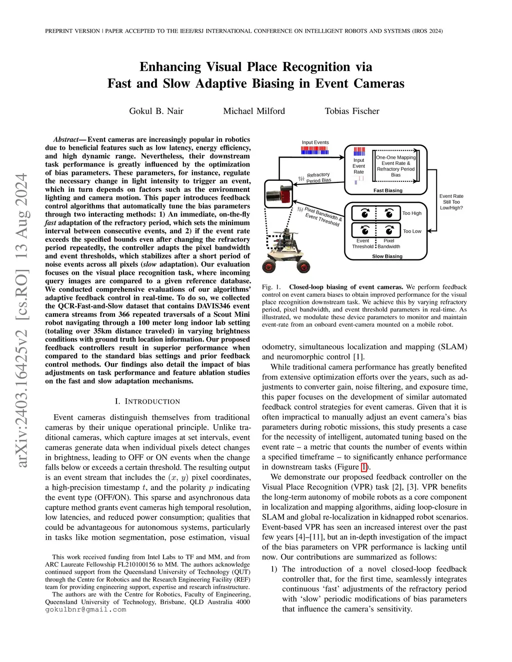 Event cameras are increasingly popular in robotics due to their beneficial features, such as low latency, energy efficiency, and high dynamic range. Nevertheless, their downstream task performance is greatly influenced by the optimization of bias parameters. These parameters, for instance, regulate the necessary change in light intensity to trigger an event, which in turn depends on factors such as the environment lighting and camera motion. This paper introduces feedback control algorithms that automatically tune the bias parameters through two interacting methods: 1) An immediate, on-the-fly fast adaptation of the refractory period, which sets the minimum interval between consecutive events, and 2) if the event rate exceeds the specified bounds even after changing the refractory period repeatedly, the controller adapts the pixel bandwidth and event thresholds, which stabilizes after a short period of noise events across all pixels (slow adaptation). Our evaluation focuses on the visual place recognition task, where incoming query images are compared to a given reference database. We conducted comprehensive evaluations of our algorithms' adaptive feedback control in real-time. To do so, we collected the QCR-Fast-and-Slow dataset that contains DAVIS346 event camera streams from 366 repeated traversals of a Scout Mini robot navigating through a 100 meter long indoor lab setting (totaling over 35km distance traveled) in varying brightness conditions with ground truth location information. Our proposed feedback controllers result in superior performance when compared to the standard bias settings and prior feedback control methods. Our findings also detail the impact of bias adjustments on task performance and feature ablation studies on the fast and slow adaptation mechanisms.