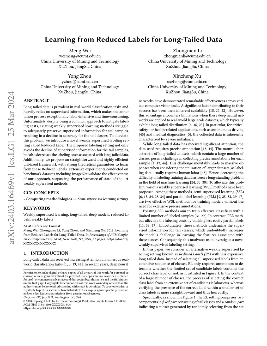 Long-tailed data is prevalent in real-world classification tasks and heavily relies on supervised information, which makes the annotation process exceptionally labor-intensive and time-consuming. Unfortunately, despite being a common approach to mitigate labeling costs, existing weakly supervised learning methods struggle to adequately preserve supervised information for tail samples, resulting in a decline in accuracy for the tail classes. To alleviate this problem, we introduce a novel weakly supervised labeling setting called Reduced Label. The proposed labeling setting not only avoids the decline of supervised information for the tail samples, but also decreases the labeling costs associated with long-tailed data. Additionally, we propose an straightforward and highly efficient unbiased framework with strong theoretical guarantees to learn from these Reduced Labels. Extensive experiments conducted on benchmark datasets including ImageNet validate the effectiveness of our approach, surpassing the performance of state-of-the-art weakly supervised methods.