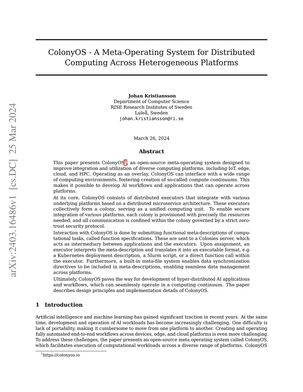 This paper presents ColonyOS, an open-source meta-operating system designed to improve integration and utilization of diverse computing platforms, including IoT, edge, cloud, and HPC. Operating as an overlay, ColonyOS can interface with a wide range of computing environments, fostering creation of so-called compute continuums. This makes it possible to develop AI workflows and applications that can operate across platforms. At its core, ColonyOS consists of distributed executors that integrate with various underlying platforms based on a distributed microservice architecture. These executors collectively form a colony, serving as a unified computing unit. To enable secure integration of various platforms, each colony is provisioned with precisely the resources needed, and all communication is confined within the colony governed by a strict zero-trust security protocol. Interaction with ColonyOS is done by submitting functional meta-descriptions of computational tasks, called function specifications. These are sent to a Colonies server, which acts as intermediary between applications and the executors. Upon assignment, an executor interprets the meta-description and translates it into an executable format, e.g. a Kubernetes deployment description, a Slurm script, or a direct function call within the executor. Furthermore, a built-in meta-file system enables data synchronization directives to be included in meta-descriptions, enabling seamless data management across platforms. Ultimately, ColonyOS paves the way for development of hyper-distributed applications and workflows, which can seamlessly operate in a computing continuum. The paper describes design principles and implementation details of ColonyOS.