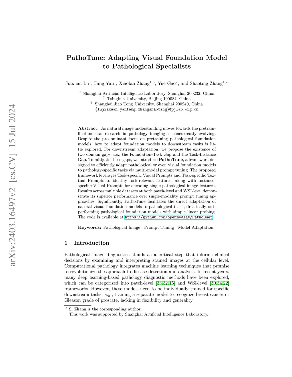 As natural image understanding moves towards the pretrain-finetune era, research in pathology imaging is concurrently evolving. Despite the predominant focus on pretraining pathological foundation models, how to adapt foundation models to downstream tasks is little explored. For downstream adaptation, we propose the existence of two domain gaps, i.e., the Foundation-Task Gap and the Task-Instance Gap. To mitigate these gaps, we introduce PathoTune, a framework designed to efficiently adapt pathological or even visual foundation models to pathology-specific tasks via multi-modal prompt tuning. The proposed framework leverages Task-specific Visual Prompts and Task-specific Textual Prompts to identify task-relevant features, along with Instance-specific Visual Prompts for encoding single pathological image features. Results across multiple datasets at both patch-level and WSI-level demonstrate its superior performance over single-modality prompt tuning approaches. Significantly, PathoTune facilitates the direct adaptation of natural visual foundation models to pathological tasks, drastically outperforming pathological foundation models with simple linear probing. The code is available at https://github.com/openmedlab/PathoDuet.