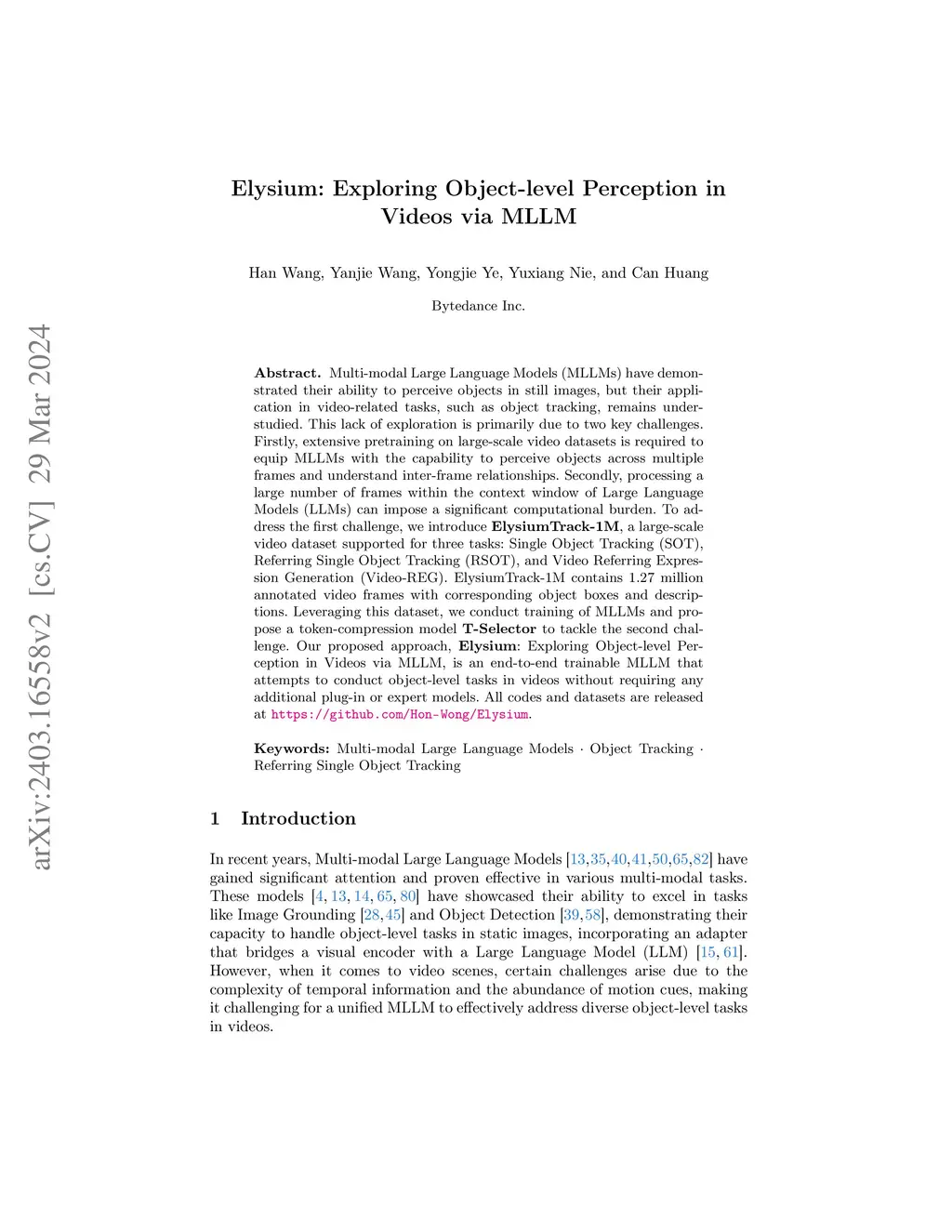 Multi-modal Large Language Models (MLLMs) have demonstrated their ability to perceive objects in still images, but their application in video-related tasks, such as object tracking, remains understudied. This lack of exploration is primarily due to two key challenges. Firstly, extensive pretraining on large-scale video datasets is required to equip MLLMs with the capability to perceive objects across multiple frames and understand inter-frame relationships. Secondly, processing a large number of frames within the context window of Large Language Models (LLMs) can impose a significant computational burden. To address the first challenge, we introduce ElysiumTrack-1M, a large-scale video dataset supported for three tasks: Single Object Tracking (SOT), Referring Single Object Tracking (RSOT), and Video Referring Expression Generation (Video-REG). ElysiumTrack-1M contains 1.27 million annotated video frames with corresponding object boxes and descriptions. Leveraging this dataset, we conduct training of MLLMs and propose a token-compression model T-Selector to tackle the second challenge. Our proposed approach, Elysium: Exploring Object-level Perception in Videos via MLLM, is an end-to-end trainable MLLM that attempts to conduct object-level tasks in videos without requiring any additional plug-in or expert models. All codes and datasets are available at https://github.com/Hon-Wong/Elysium.