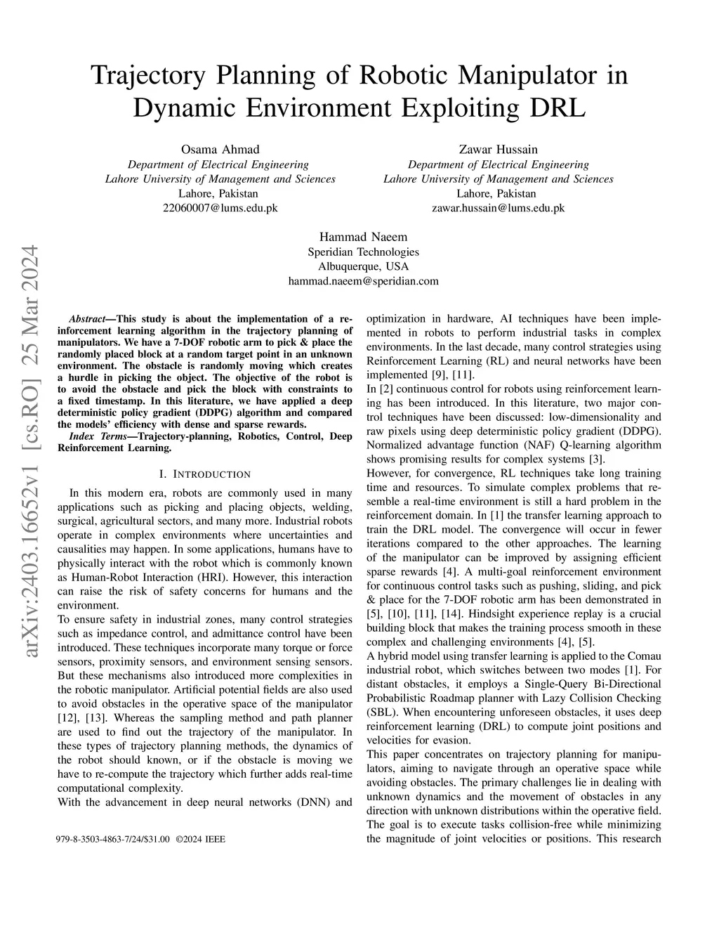 This study is about the implementation of a reinforcement learning algorithm in the trajectory planning of manipulators. We have a 7-DOF robotic arm to pick and place the randomly placed block at a random target point in an unknown environment. The obstacle is randomly moving which creates a hurdle in picking the object. The objective of the robot is to avoid the obstacle and pick the block with constraints to a fixed timestamp. In this literature, we have applied a deep deterministic policy gradient (DDPG) algorithm and compared the model's efficiency with dense and sparse rewards.