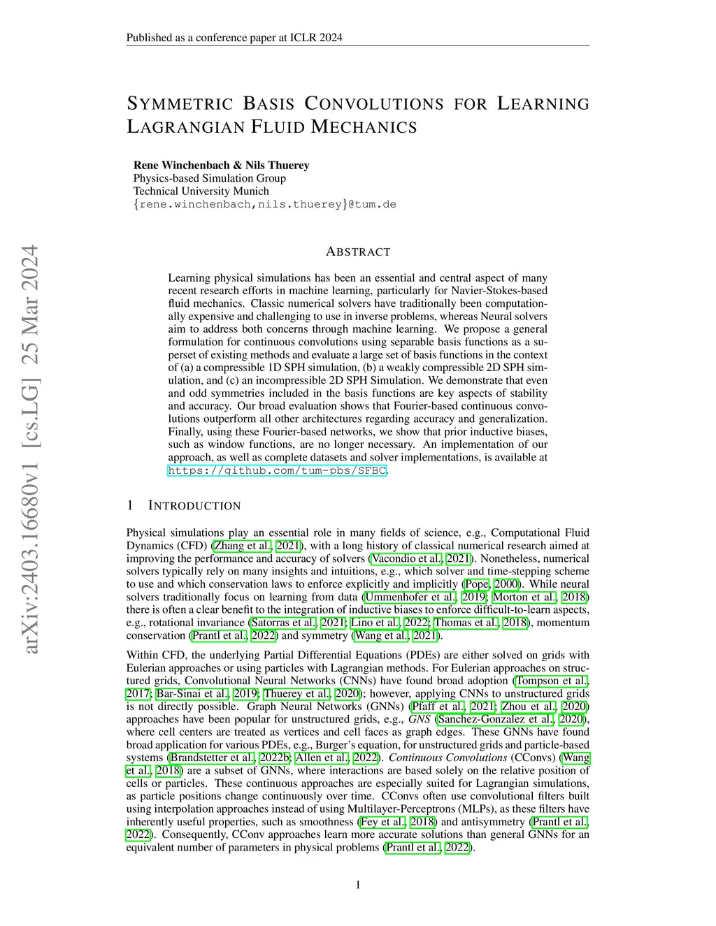 Learning physical simulations has been an essential and central aspect of many recent research efforts in machine learning, particularly for Navier-Stokes-based fluid mechanics. Classic numerical solvers have traditionally been computationally expensive and challenging to use in inverse problems, whereas Neural solvers aim to address both concerns through machine learning. We propose a general formulation for continuous convolutions using separable basis functions as a superset of existing methods and evaluate a large set of basis functions in the context of (a) a compressible 1D SPH simulation, (b) a weakly compressible 2D SPH simulation, and (c) an incompressible 2D SPH Simulation. We demonstrate that even and odd symmetries included in the basis functions are key aspects of stability and accuracy. Our broad evaluation shows that Fourier-based continuous convolutions outperform all other architectures regarding accuracy and generalization. Finally, using these Fourier-based networks, we show that prior inductive biases, such as window functions, are no longer necessary. An implementation of our approach, as well as complete datasets and solver implementations, is available at https://github.com/tum-pbs/SFBC.