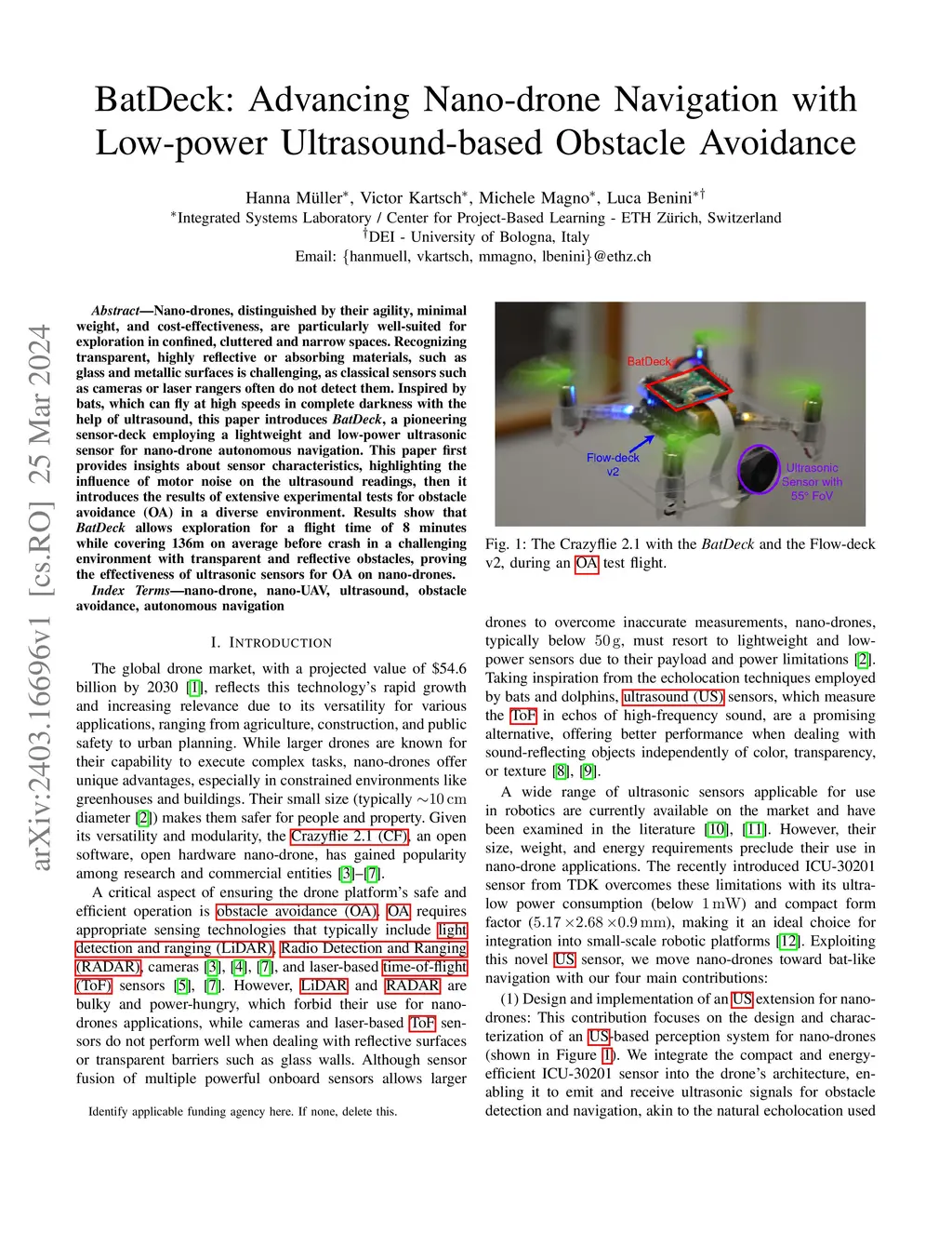 Nano-drones, distinguished by their agility, minimal weight, and cost-effectiveness, are particularly well-suited for exploration in confined, cluttered and narrow spaces. Recognizing transparent, highly reflective or absorbing materials, such as glass and metallic surfaces is challenging, as classical sensors, such as cameras or laser rangers, often do not detect them. Inspired by bats, which can fly at high speeds in complete darkness with the help of ultrasound, this paper introduces \textit{BatDeck}, a pioneering sensor-deck employing a lightweight and low-power ultrasonic sensor for nano-drone autonomous navigation. This paper first provides insights about sensor characteristics, highlighting the influence of motor noise on the ultrasound readings, then it introduces the results of extensive experimental tests for obstacle avoidance (OA) in a diverse environment. Results show that \textit{BatDeck} allows exploration for a flight time of 8 minutes while covering 136m on average before crash in a challenging environment with transparent and reflective obstacles, proving the effectiveness of ultrasonic sensors for OA on nano-drones.