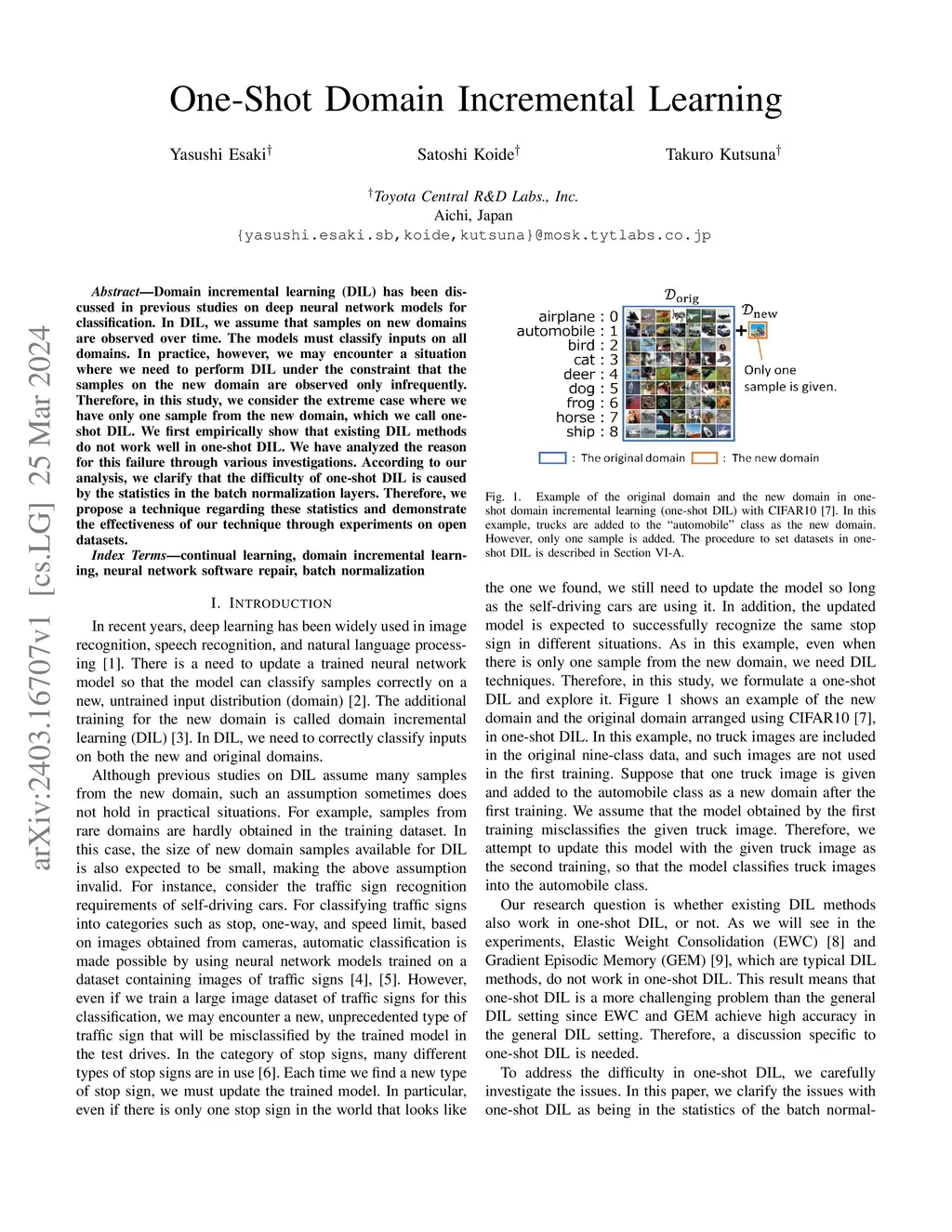 Domain incremental learning (DIL) has been discussed in previous studies on deep neural network models for classification. In DIL, we assume that samples on new domains are observed over time. The models must classify inputs on all domains. In practice, however, we may encounter a situation where we need to perform DIL under the constraint that the samples on the new domain are observed only infrequently. Therefore, in this study, we consider the extreme case where we have only one sample from the new domain, which we call one-shot DIL. We first empirically show that existing DIL methods do not work well in one-shot DIL. We have analyzed the reason for this failure through various investigations. According to our analysis, we clarify that the difficulty of one-shot DIL is caused by the statistics in the batch normalization layers. Therefore, we propose a technique regarding these statistics and demonstrate the effectiveness of our technique through experiments on open datasets.