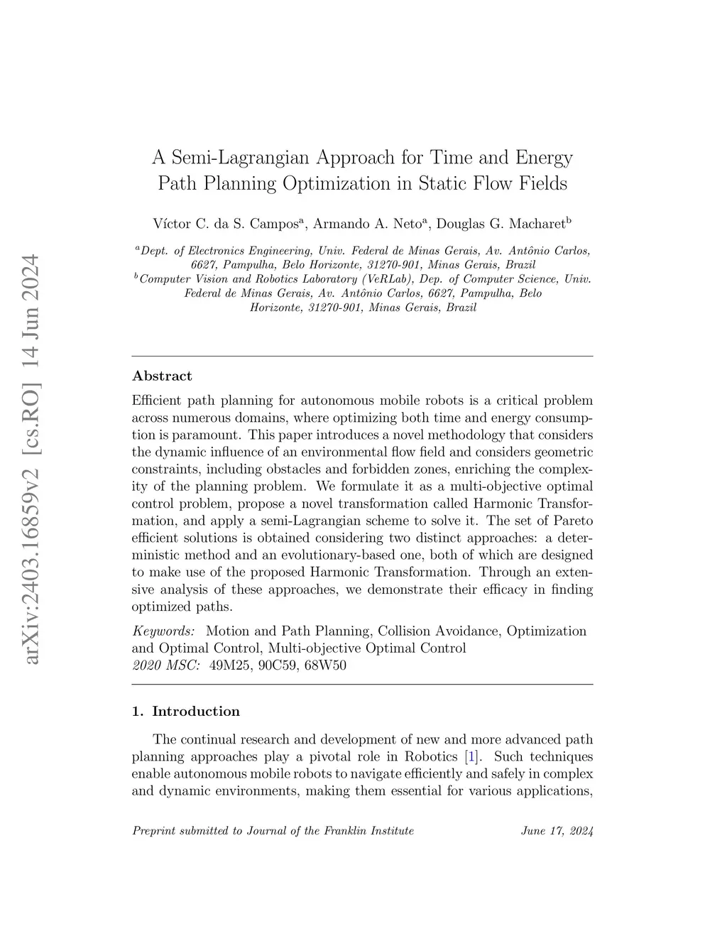 Efficient path planning for autonomous mobile robots is a critical problem across numerous domains, where optimizing both time and energy consumption is paramount. This paper introduces a novel methodology that considers the dynamic influence of an environmental flow field and considers geometric constraints, including obstacles and forbidden zones, enriching the complexity of the planning problem. We formulate it as a multi-objective optimal control problem, propose a novel transformation called Harmonic Transformation, and apply a semi-Lagrangian scheme to solve it. The set of Pareto efficient solutions is obtained considering two distinct approaches: a deterministic method and an evolutionary-based one, both of which are designed to make use of the proposed Harmonic Transformation. Through an extensive analysis of these approaches, we demonstrate their efficacy in finding optimized paths.