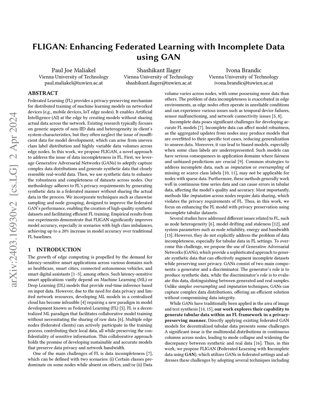 Federated Learning (FL) provides a privacy-preserving mechanism for distributed training of machine learning models on networked devices (e.g., mobile devices, IoT edge nodes). It enables Artificial Intelligence (AI) at the edge by creating models without sharing actual data across the network. Existing research typically focuses on generic aspects of non-IID data and heterogeneity in client's system characteristics, but they often neglect the issue of insufficient data for model development, which can arise from uneven class label distribution and highly variable data volumes across edge nodes. In this work, we propose FLIGAN, a novel approach to address the issue of data incompleteness in FL. First, we leverage Generative Adversarial Networks (GANs) to adeptly capture complex data distributions and generate synthetic data that closely resemble real-world data. Then, we use synthetic data to enhance the robustness and completeness of datasets across nodes. Our methodology adheres to FL's privacy requirements by generating synthetic data in a federated manner without sharing the actual data in the process. We incorporate techniques such as classwise sampling and node grouping, designed to improve the federated GAN's performance, enabling the creation of high-quality synthetic datasets and facilitating efficient FL training. Empirical results from our experiments demonstrate that FLIGAN significantly improves model accuracy, especially in scenarios with high class imbalances, achieving up to a 20% increase in model accuracy over traditional FL baselines.