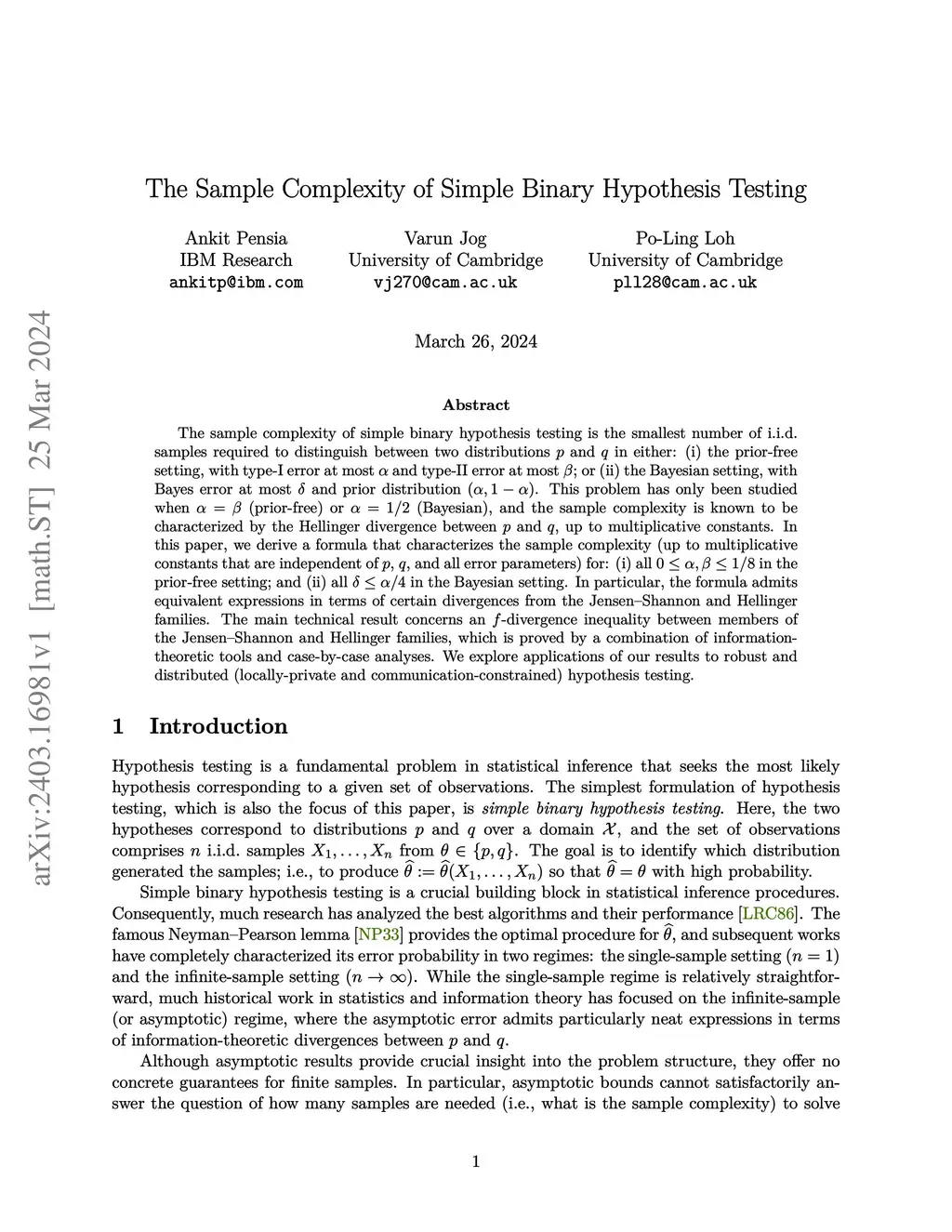 The sample complexity of simple binary hypothesis testing is the smallest number of i.i.d.\ samples required to distinguish between two distributions and in either: (i) the prior-free setting, with type-I error at most and type-II error at most ; or (ii) the Bayesian setting, with Bayes error at most and prior distribution . This problem has only been studied when (prior-free) or (Bayesian), and the sample complexity is known to be characterized by the Hellinger divergence between and , up to multiplicative constants. In this paper, we derive a formula that characterizes the sample complexity (up to multiplicative constants that are independent of , , and all error parameters) for: (i) all in the prior-free setting; and (ii) all in the Bayesian setting. In particular, the formula admits equivalent expressions in terms of certain divergences from the Jensen--Shannon and Hellinger families. The main technical result concerns an -divergence inequality between members of the Jensen--Shannon and Hellinger families, which is proved by a combination of information-theoretic tools and case-by-case analyses. We explore applications of our results to (i) robust hypothesis testing, (ii) distributed (locally-private and communication-constrained) hypothesis testing, (iii) sequential hypothesis testing, and (iv) hypothesis testing with erasures.