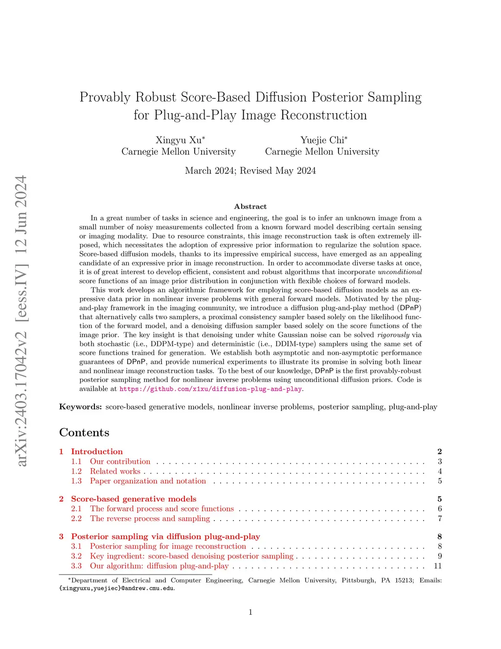In a great number of tasks in science and engineering, the goal is to infer an unknown image from a small number of measurements collected from a known forward model describing certain sensing or imaging modality. Due to resource constraints, this task is often extremely ill-posed, which necessitates the adoption of expressive prior information to regularize the solution space. Score-based diffusion models, due to its impressive empirical success, have emerged as an appealing candidate of an expressive prior in image reconstruction. In order to accommodate diverse tasks at once, it is of great interest to develop efficient, consistent and robust algorithms that incorporate unconditional score functions of an image prior distribution in conjunction with flexible choices of forward models. This work develops an algorithmic framework for employing score-based diffusion models as an expressive data prior in general nonlinear inverse problems. Motivated by the plug-and-play framework in the imaging community, we introduce a diffusion plug-and-play method (DPnP) that alternatively calls two samplers, a proximal consistency sampler based solely on the likelihood function of the forward model, and a denoising diffusion sampler based solely on the score functions of the image prior. The key insight is that denoising under white Gaussian noise can be solved rigorously via both stochastic (i.e., DDPM-type) and deterministic (i.e., DDIM-type) samplers using the unconditional score functions. We establish both asymptotic and non-asymptotic performance guarantees of DPnP, and provide numerical experiments to illustrate its promise in solving both linear and nonlinear image reconstruction tasks. To the best of our knowledge, DPnP is the first provably-robust posterior sampling method for nonlinear inverse problems using unconditional diffusion priors.