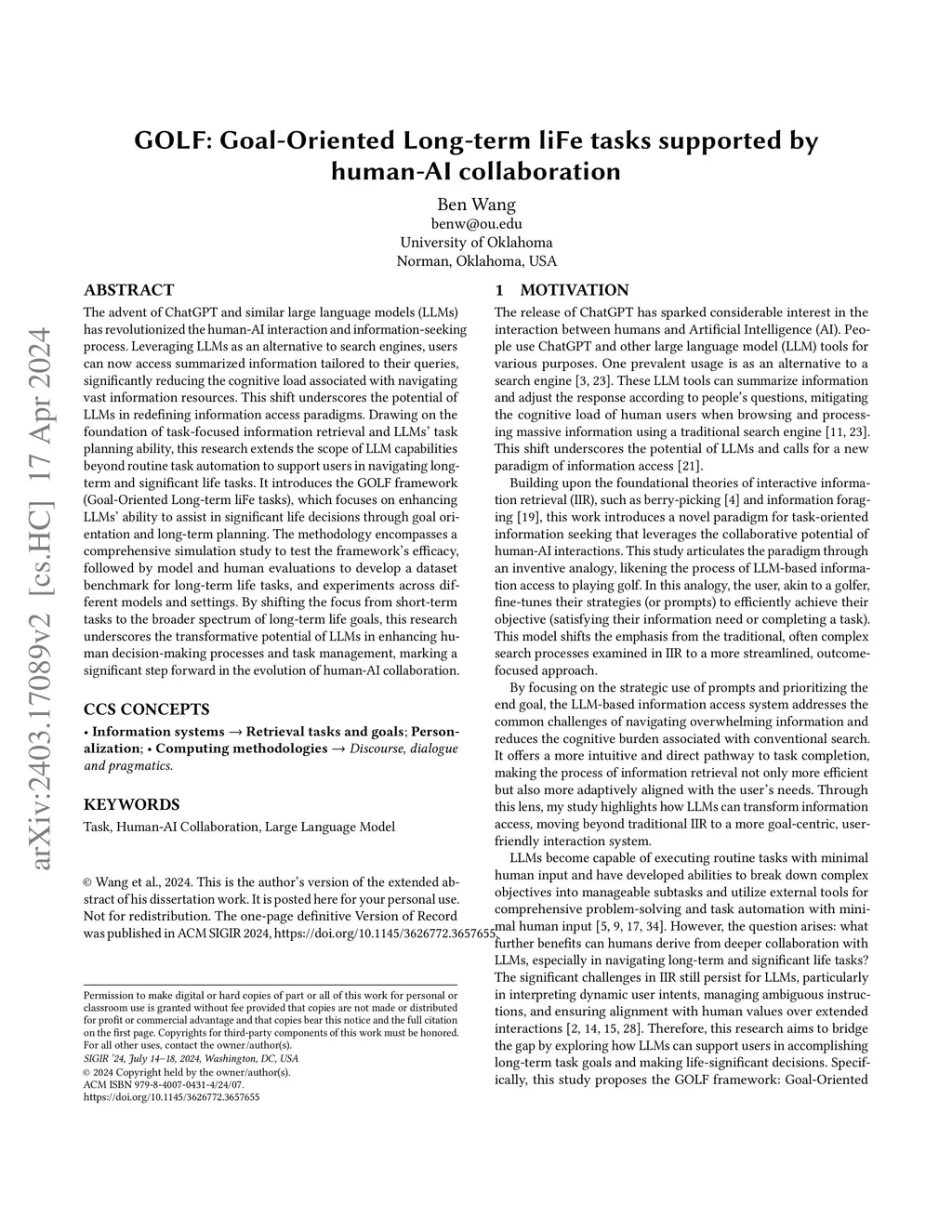GOLF: Goal-Oriented Long-term liFe tasks supported by human-AI