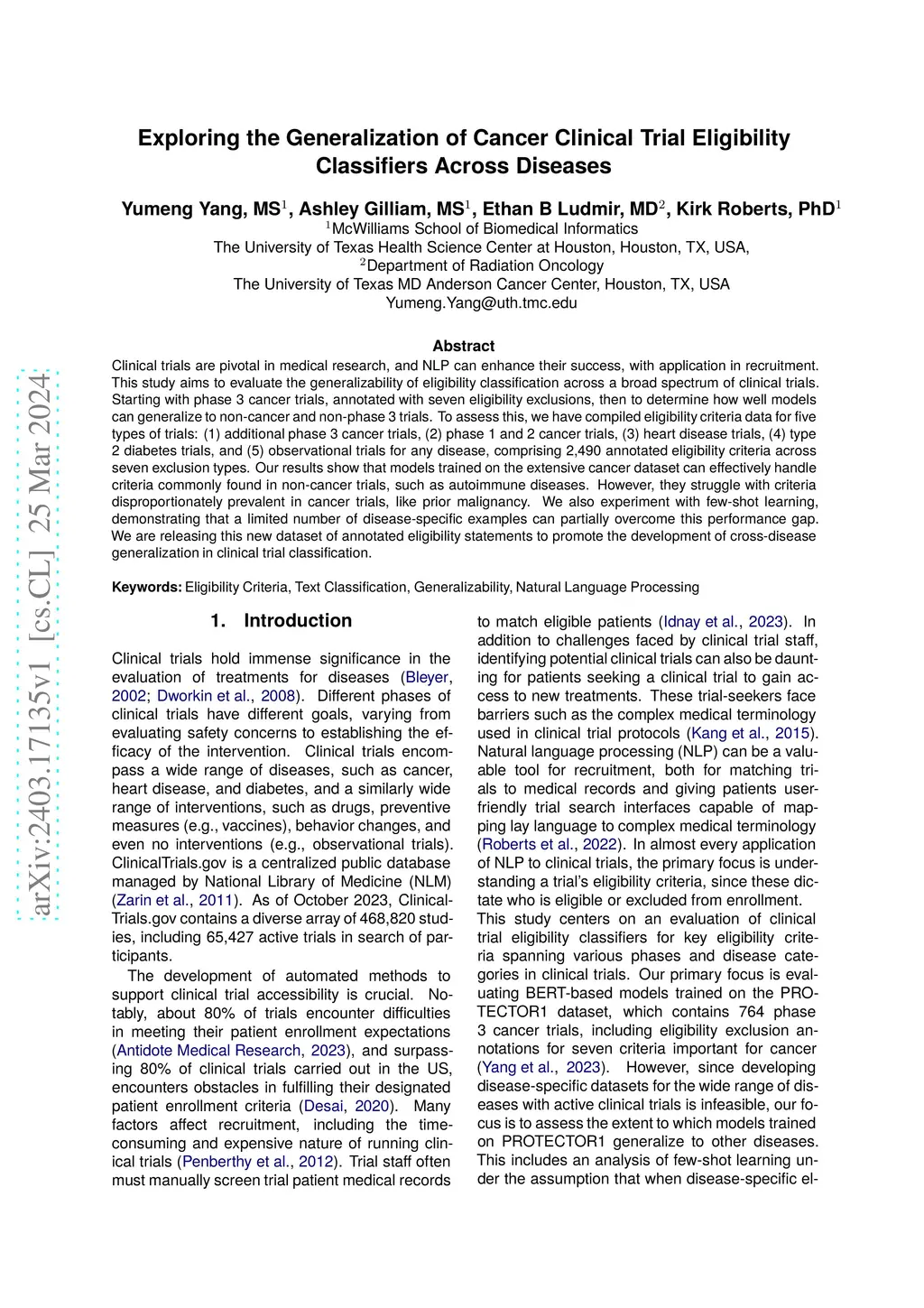 Clinical trials are pivotal in medical research, and NLP can enhance their success, with application in recruitment. This study aims to evaluate the generalizability of eligibility classification across a broad spectrum of clinical trials. Starting with phase 3 cancer trials, annotated with seven eligibility exclusions, then to determine how well models can generalize to non-cancer and non-phase 3 trials. To assess this, we have compiled eligibility criteria data for five types of trials: (1) additional phase 3 cancer trials, (2) phase 1 and 2 cancer trials, (3) heart disease trials, (4) type 2 diabetes trials, and (5) observational trials for any disease, comprising 2,490 annotated eligibility criteria across seven exclusion types. Our results show that models trained on the extensive cancer dataset can effectively handle criteria commonly found in non-cancer trials, such as autoimmune diseases. However, they struggle with criteria disproportionately prevalent in cancer trials, like prior malignancy. We also experiment with few-shot learning, demonstrating that a limited number of disease-specific examples can partially overcome this performance gap. We are releasing this new dataset of annotated eligibility statements to promote the development of cross-disease generalization in clinical trial classification.