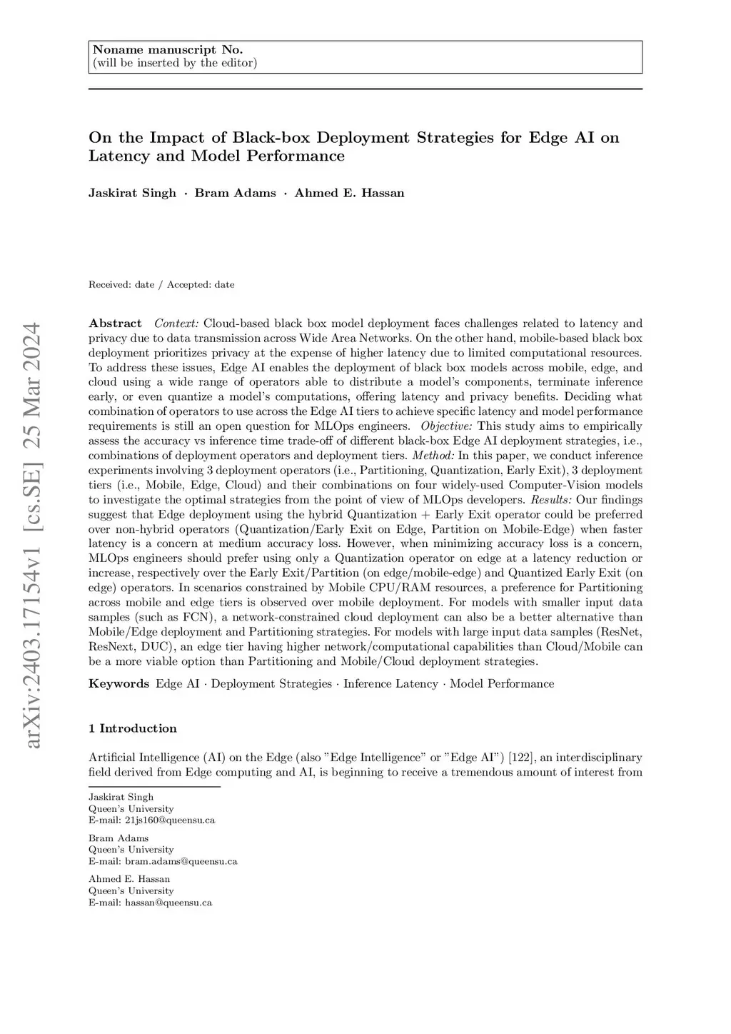 Deciding what combination of operators to use across the Edge AI tiers to achieve specific latency and model performance requirements is an open question for MLOps engineers. This study aims to empirically assess the accuracy vs inference time trade-off of different black-box Edge AI deployment strategies, i.e., combinations of deployment operators and deployment tiers. In this paper, we conduct inference experiments involving 3 deployment operators (i.e., Partitioning, Quantization, Early Exit), 3 deployment tiers (i.e., Mobile, Edge, Cloud) and their combinations on four widely used Computer-Vision models to investigate the optimal strategies from the point of view of MLOps developers. Our findings suggest that Edge deployment using the hybrid Quantization + Early Exit operator could be preferred over non-hybrid operators (Quantization/Early Exit on Edge, Partition on Mobile-Edge) when faster latency is a concern at medium accuracy loss. However, when minimizing accuracy loss is a concern, MLOps engineers should prefer using only a Quantization operator on edge at a latency reduction or increase, respectively over the Early Exit/Partition (on edge/mobile-edge) and Quantized Early Exit (on edge) operators. In scenarios constrained by Mobile CPU/RAM resources, a preference for Partitioning across mobile and edge tiers is observed over mobile deployment. For models with smaller input data samples (such as FCN), a network-constrained cloud deployment can also be a better alternative than Mobile/Edge deployment and Partitioning strategies. For models with large input data samples (ResNet, ResNext, DUC), an edge tier having higher network/computational capabilities than Cloud/Mobile can be a more viable option than Partitioning and Mobile/Cloud deployment strategies.