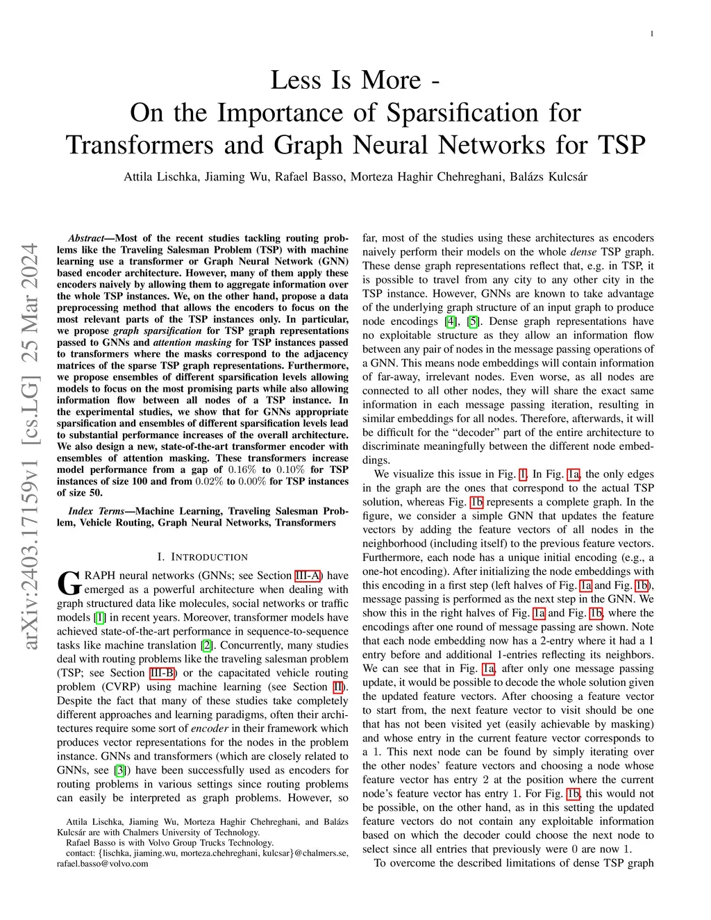 Most of the recent studies tackling routing problems like the Traveling Salesman Problem (TSP) with machine learning use a transformer or Graph Neural Network (GNN) based encoder architecture. However, many of them apply these encoders naively by allowing them to aggregate information over the whole TSP instances. We, on the other hand, propose a data preprocessing method that allows the encoders to focus on the most relevant parts of the TSP instances only. In particular, we propose graph sparsification for TSP graph representations passed to GNNs and attention masking for TSP instances passed to transformers where the masks correspond to the adjacency matrices of the sparse TSP graph representations. Furthermore, we propose ensembles of different sparsification levels allowing models to focus on the most promising parts while also allowing information flow between all nodes of a TSP instance. In the experimental studies, we show that for GNNs appropriate sparsification and ensembles of different sparsification levels lead to substantial performance increases of the overall architecture. We also design a new, state-of-the-art transformer encoder with ensembles of attention masking. These transformers increase model performance from a gap of to for TSP instances of size 100 and from to for TSP instances of size 50.