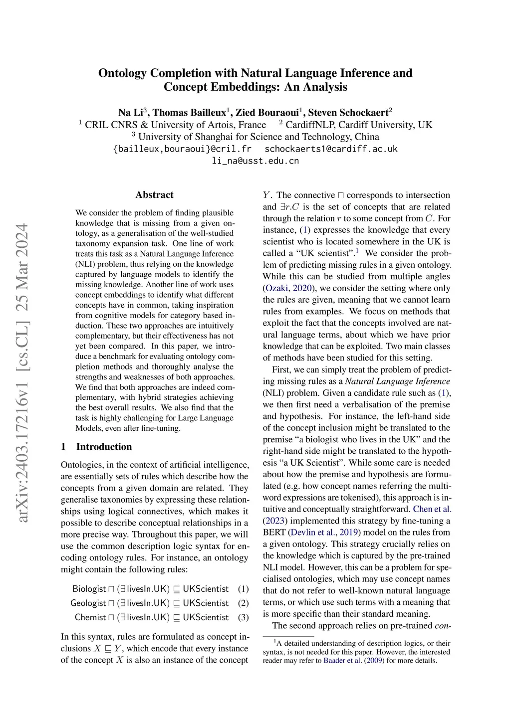 We consider the problem of finding plausible knowledge that is missing from a given ontology, as a generalisation of the well-studied taxonomy expansion task. One line of work treats this task as a Natural Language Inference (NLI) problem, thus relying on the knowledge captured by language models to identify the missing knowledge. Another line of work uses concept embeddings to identify what different concepts have in common, taking inspiration from cognitive models for category based induction. These two approaches are intuitively complementary, but their effectiveness has not yet been compared. In this paper, we introduce a benchmark for evaluating ontology completion methods and thoroughly analyse the strengths and weaknesses of both approaches. We find that both approaches are indeed complementary, with hybrid strategies achieving the best overall results. We also find that the task is highly challenging for Large Language Models, even after fine-tuning.