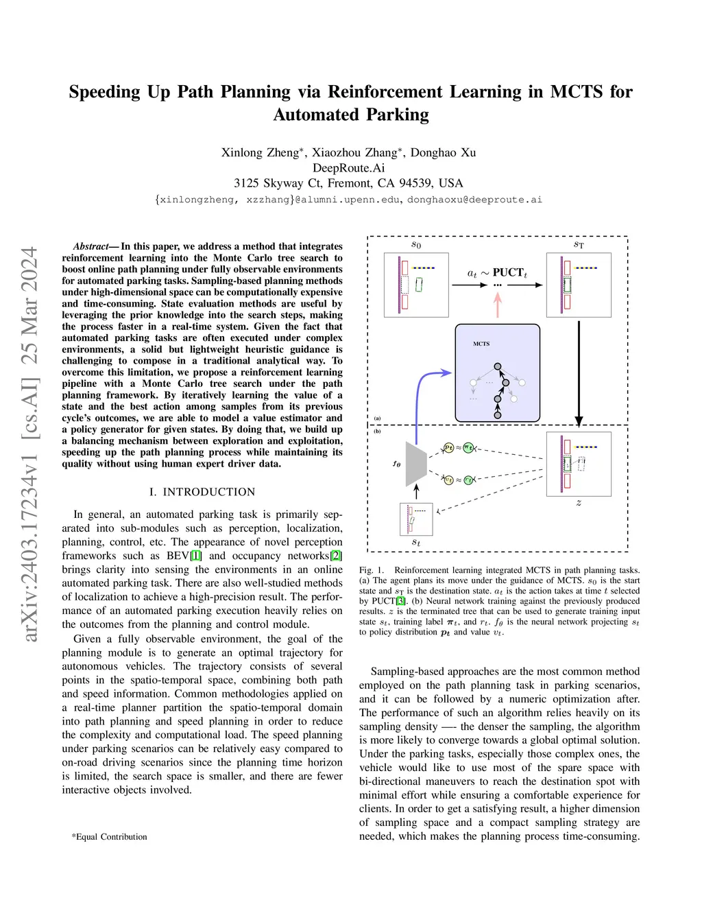 In this paper, we address a method that integrates reinforcement learning into the Monte Carlo tree search to boost online path planning under fully observable environments for automated parking tasks. Sampling-based planning methods under high-dimensional space can be computationally expensive and time-consuming. State evaluation methods are useful by leveraging the prior knowledge into the search steps, making the process faster in a real-time system. Given the fact that automated parking tasks are often executed under complex environments, a solid but lightweight heuristic guidance is challenging to compose in a traditional analytical way. To overcome this limitation, we propose a reinforcement learning pipeline with a Monte Carlo tree search under the path planning framework. By iteratively learning the value of a state and the best action among samples from its previous cycle's outcomes, we are able to model a value estimator and a policy generator for given states. By doing that, we build up a balancing mechanism between exploration and exploitation, speeding up the path planning process while maintaining its quality without using human expert driver data.
