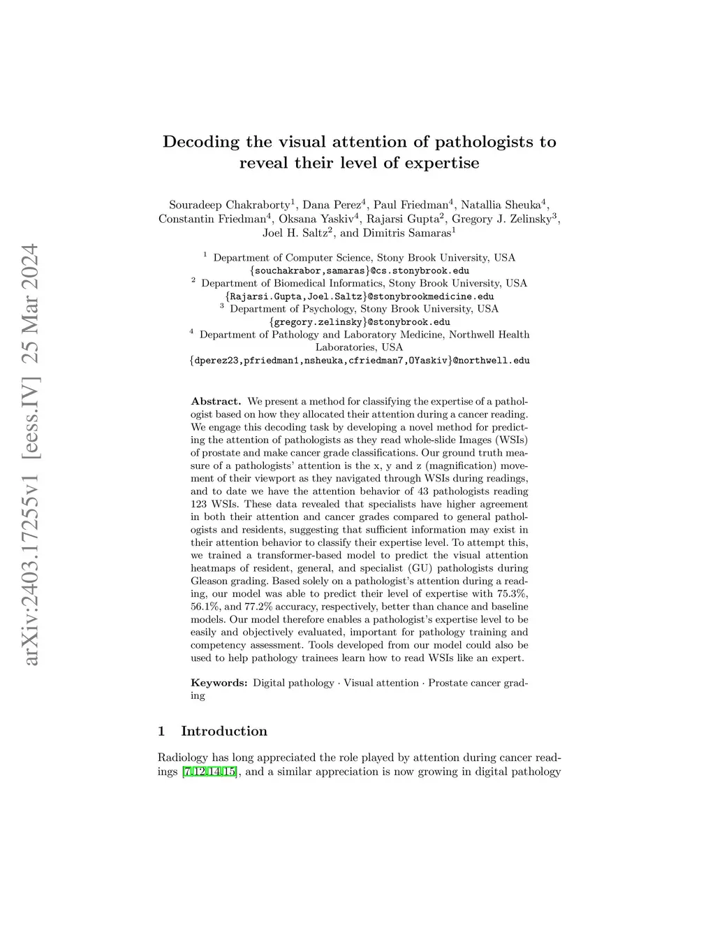 We present a method for classifying the expertise of a pathologist based on how they allocated their attention during a cancer reading. We engage this decoding task by developing a novel method for predicting the attention of pathologists as they read whole-slide Images (WSIs) of prostate and make cancer grade classifications. Our ground truth measure of a pathologists' attention is the x, y and z (magnification) movement of their viewport as they navigated through WSIs during readings, and to date we have the attention behavior of 43 pathologists reading 123 WSIs. These data revealed that specialists have higher agreement in both their attention and cancer grades compared to general pathologists and residents, suggesting that sufficient information may exist in their attention behavior to classify their expertise level. To attempt this, we trained a transformer-based model to predict the visual attention heatmaps of resident, general, and specialist (GU) pathologists during Gleason grading. Based solely on a pathologist's attention during a reading, our model was able to predict their level of expertise with 75.3%, 56.1%, and 77.2% accuracy, respectively, better than chance and baseline models. Our model therefore enables a pathologist's expertise level to be easily and objectively evaluated, important for pathology training and competency assessment. Tools developed from our model could also be used to help pathology trainees learn how to read WSIs like an expert.