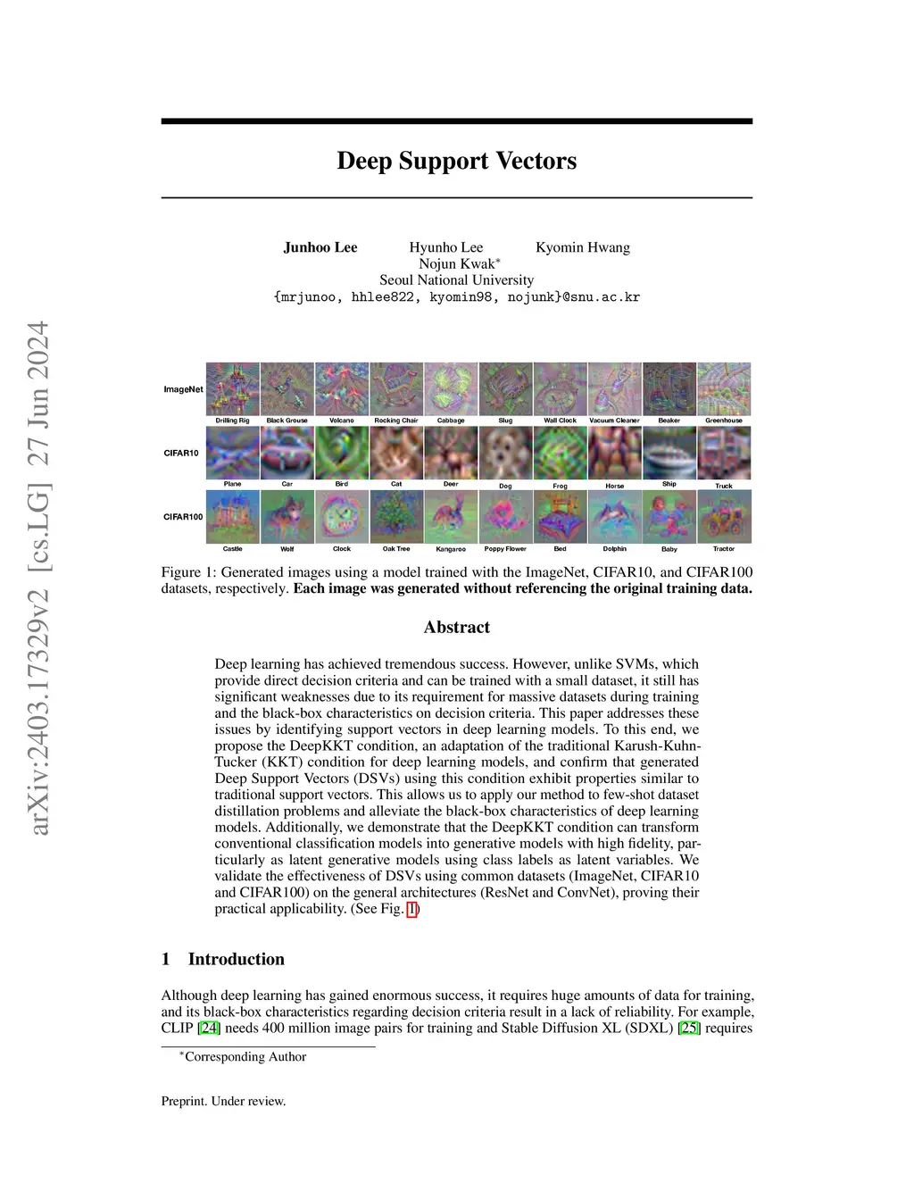 Deep learning has achieved tremendous success. However, unlike SVMs, which provide direct decision criteria and can be trained with a small dataset, it still has significant weaknesses due to its requirement for massive datasets during training and the black-box characteristics on decision criteria. This paper addresses these issues by identifying support vectors in deep learning models. To this end, we propose the DeepKKT condition, an adaptation of the traditional Karush-Kuhn-Tucker (KKT) condition for deep learning models, and confirm that generated Deep Support Vectors (DSVs) using this condition exhibit properties similar to traditional support vectors. This allows us to apply our method to few-shot dataset distillation problems and alleviate the black-box characteristics of deep learning models. Additionally, we demonstrate that the DeepKKT condition can transform conventional classification models into generative models with high fidelity, particularly as latent generative models using class labels as latent variables. We validate the effectiveness of DSVs using common datasets (ImageNet, CIFAR10 and CIFAR100) on the general architectures (ResNet and ConvNet), proving their practical applicability.
