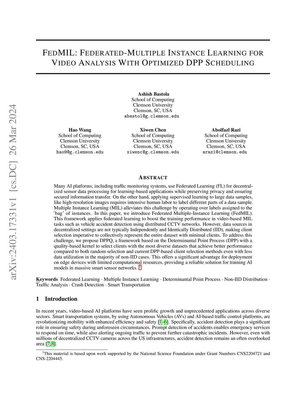 Many AI platforms, including traffic monitoring systems, use Federated Learning (FL) for decentralized sensor data processing for learning-based applications while preserving privacy and ensuring secured information transfer. On the other hand, applying supervised learning to large data samples, like high-resolution images requires intensive human labor to label different parts of a data sample. Multiple Instance Learning (MIL) alleviates this challenge by operating over labels assigned to the 'bag' of instances. In this paper, we introduce Federated Multiple-Instance Learning (FedMIL). This framework applies federated learning to boost the training performance in video-based MIL tasks such as vehicle accident detection using distributed CCTV networks. However, data sources in decentralized settings are not typically Independently and Identically Distributed (IID), making client selection imperative to collectively represent the entire dataset with minimal clients. To address this challenge, we propose DPPQ, a framework based on the Determinantal Point Process (DPP) with a quality-based kernel to select clients with the most diverse datasets that achieve better performance compared to both random selection and current DPP-based client selection methods even with less data utilization in the majority of non-IID cases. This offers a significant advantage for deployment on edge devices with limited computational resources, providing a reliable solution for training AI models in massive smart sensor networks.